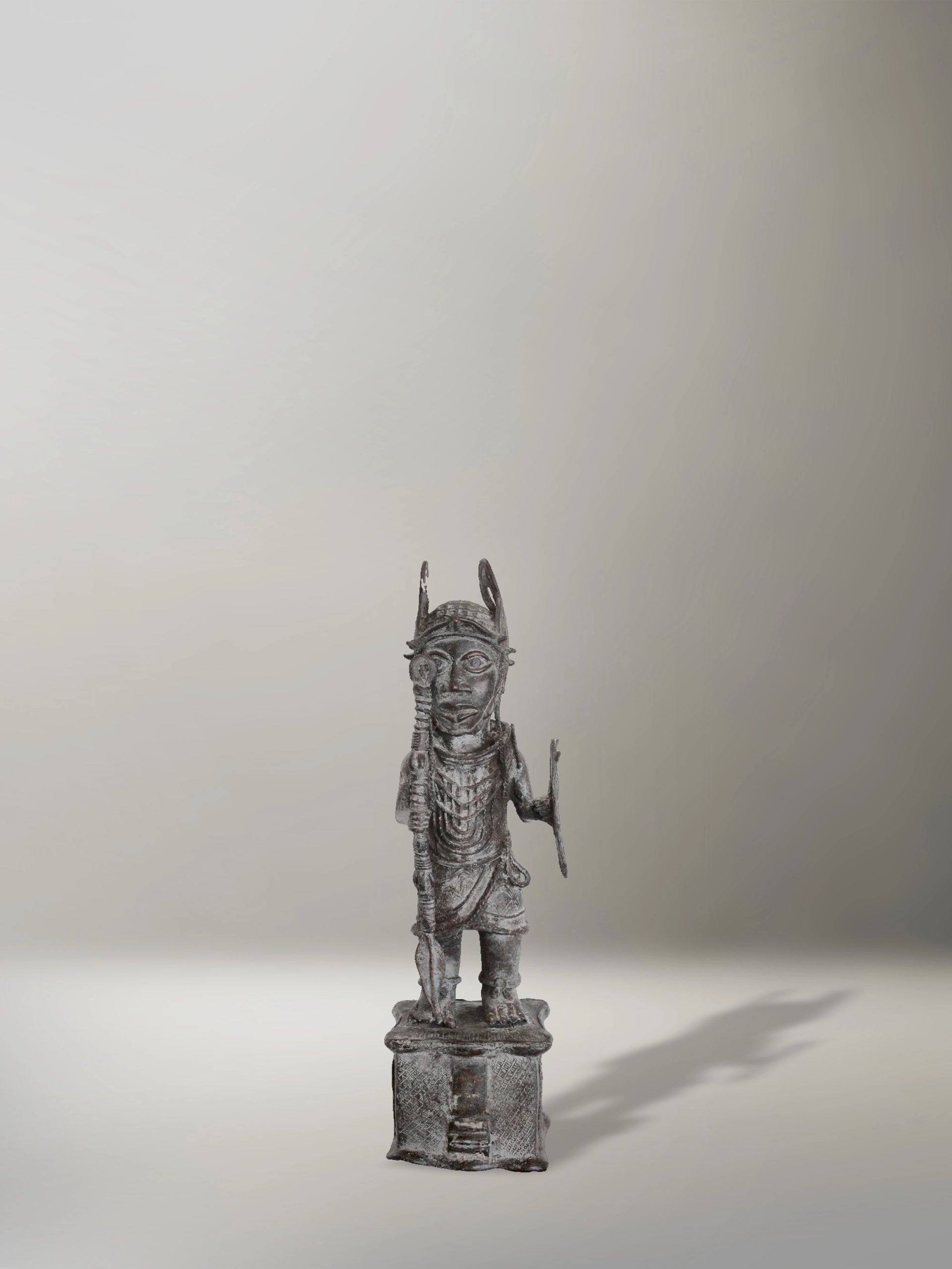 Esta escultura de bronce representa a un alto dignatario cortesano del Reino de Benín, erguido sobre una peana ornamentada que refuerza su carácter ceremonial. En su mano derecha sostiene una lanza, mientras que en la izquierda porta un escudo con el rostro de un leopardo, símbolo de poder sagrado. Su torso está adornado con collares que denotan prestigio y un faldón decorado completa su indumentaria. Destaca un casco complejo, reservado para la élite militar y espiritual. La pieza, fiel al modelo clásico anterior a 1897, encarna el prestigio colectivo de quienes sostenían el orden del reino.