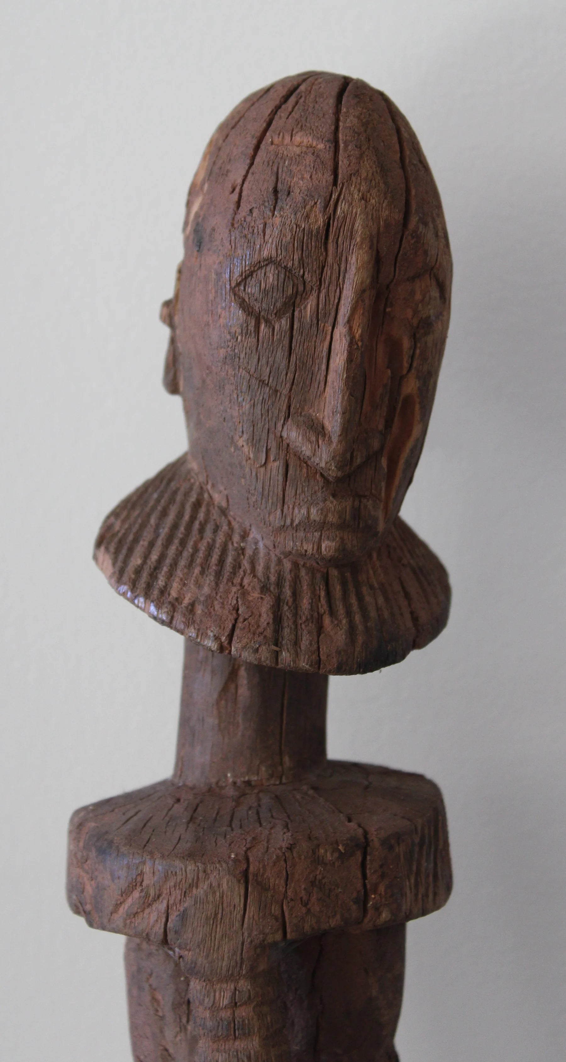 The figure has a face with diamond-shaped eyes, a sharp and pointed nose, and a prominent beard that surrounds the entire neck; a disc forms its shoulders. This statue would embody the primordial man, "nommo," formed in clay by the god Amma, still an invertebrate, called "shicouroulé" or snake man, which symbolizes the "lébbé," a mythical ancestor who is responsible for advising the "hogon" (religious leader) every night on the affairs of his people.