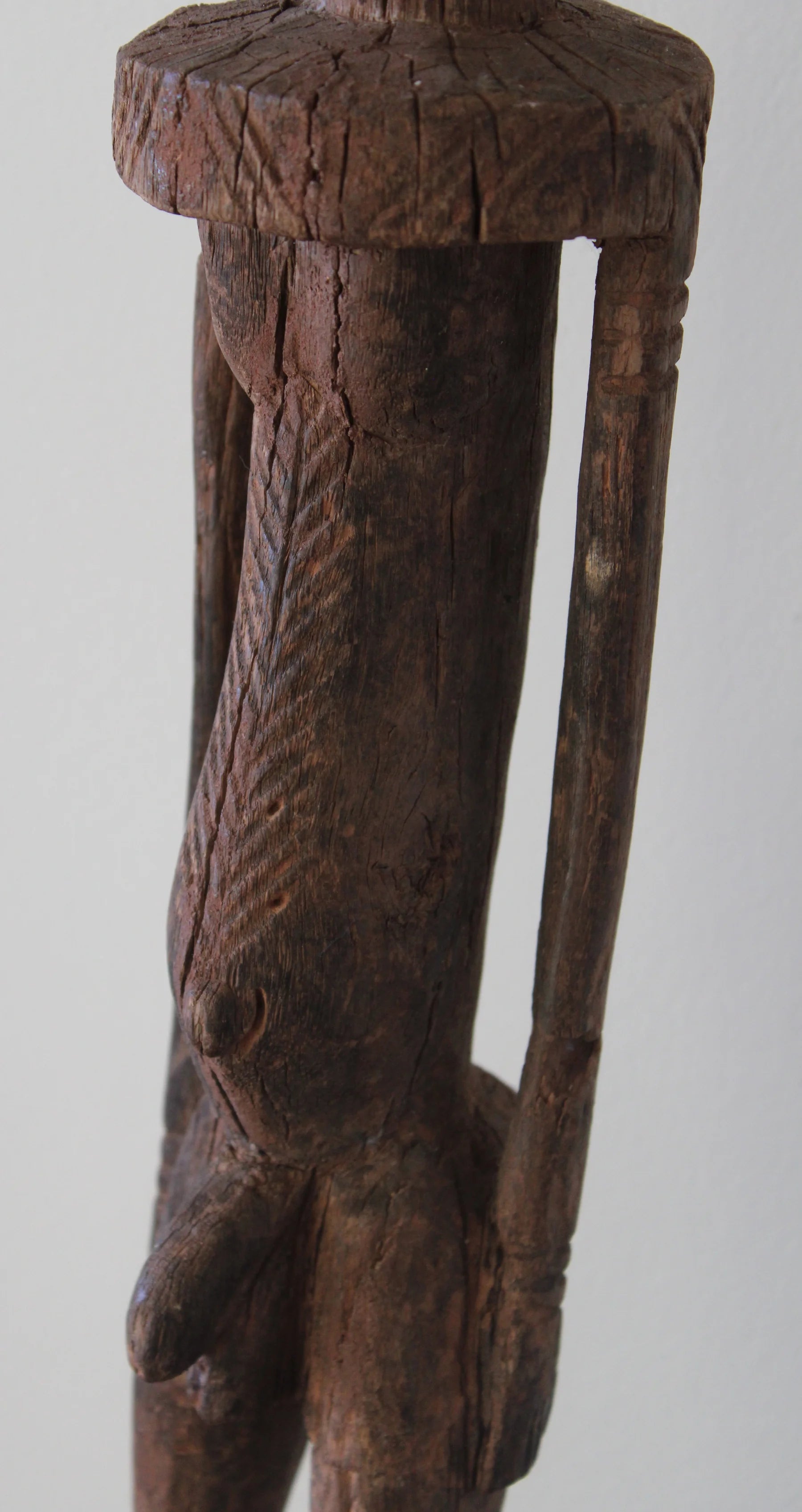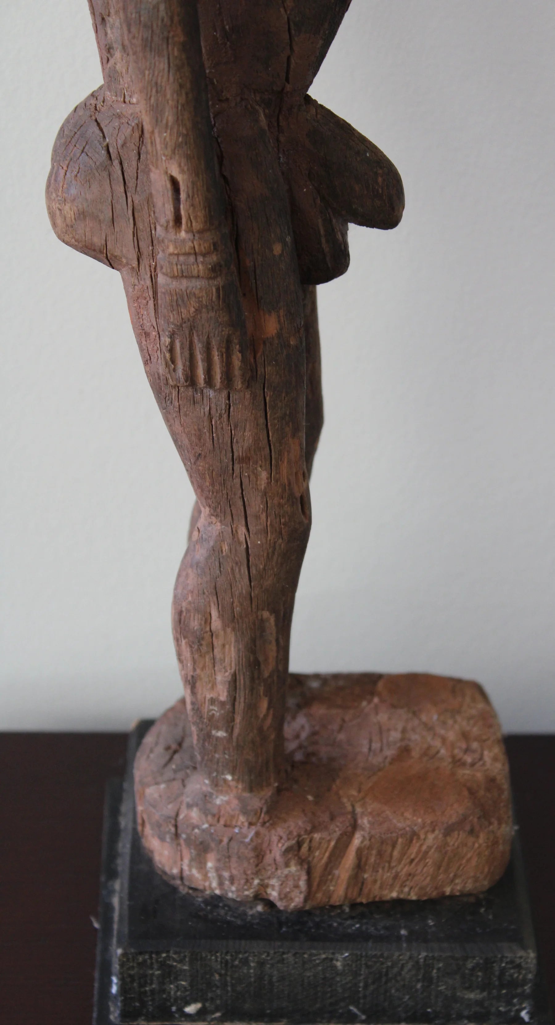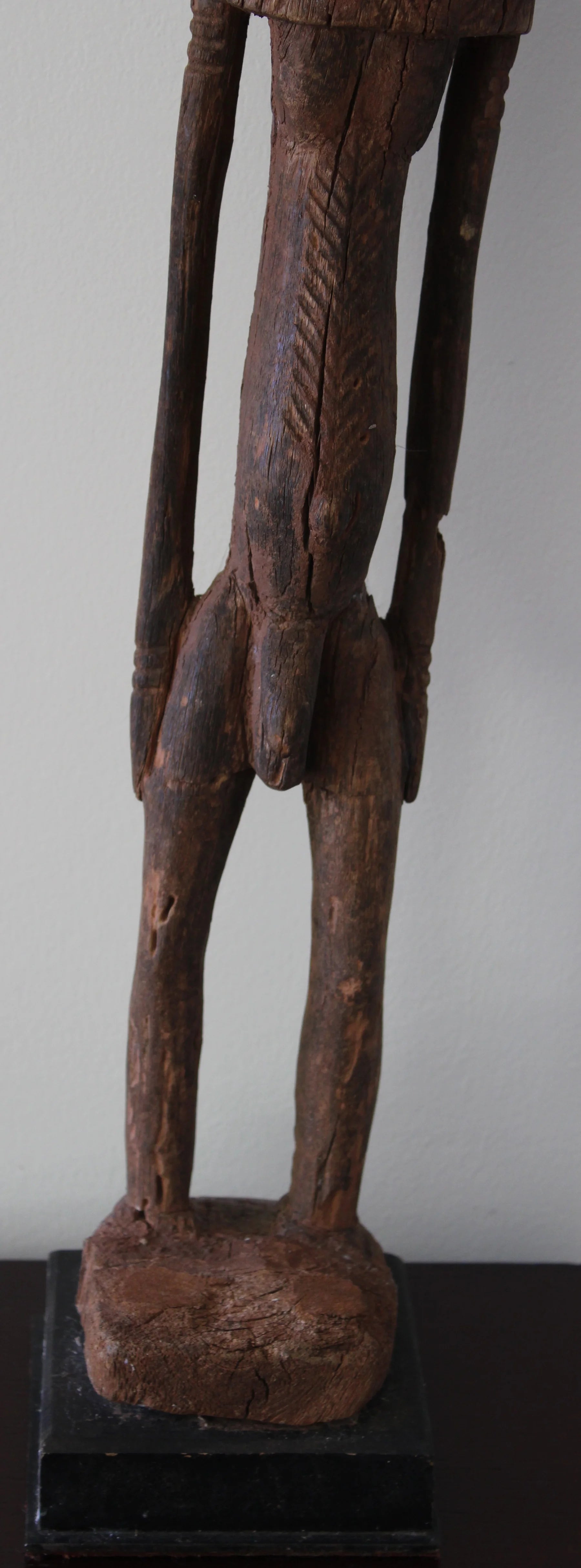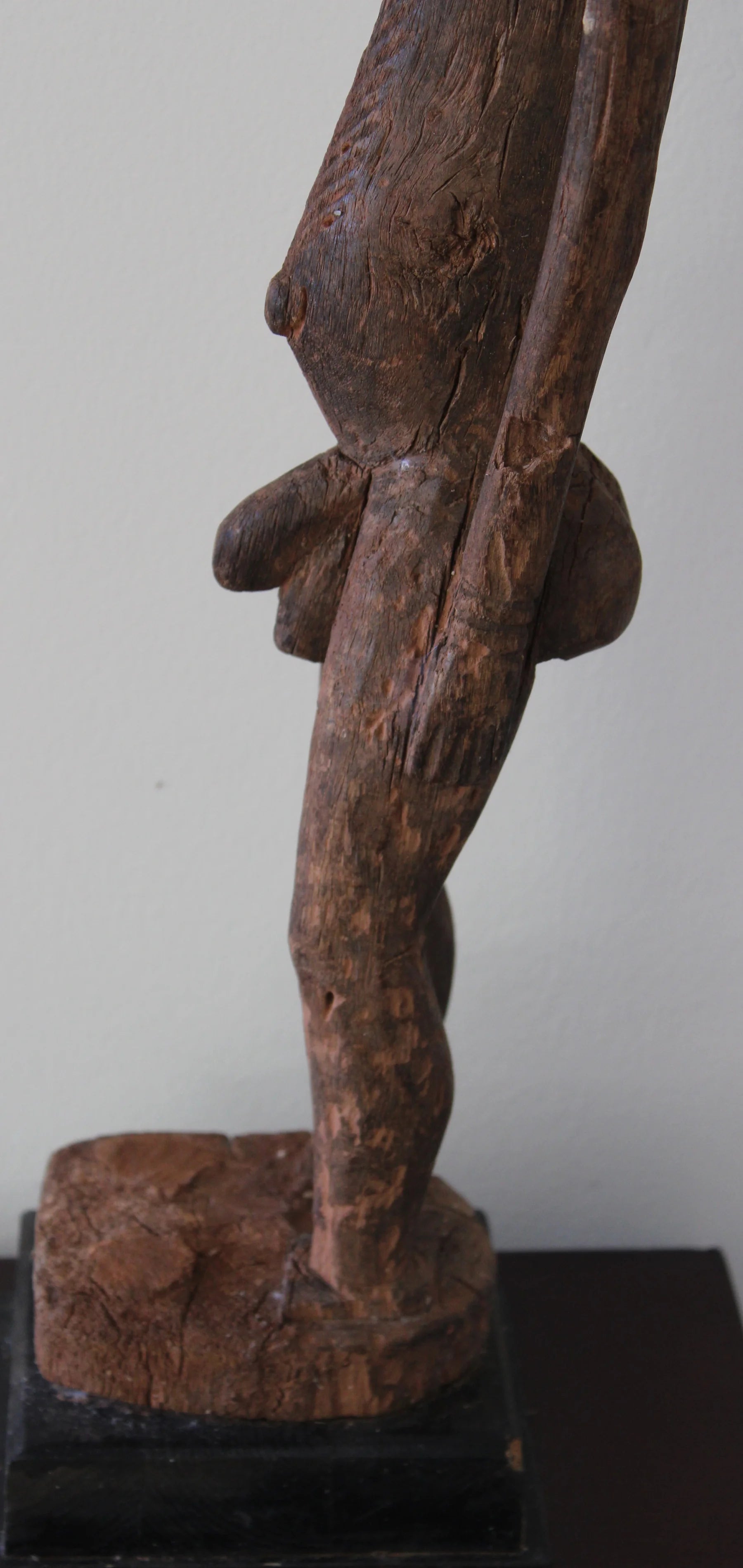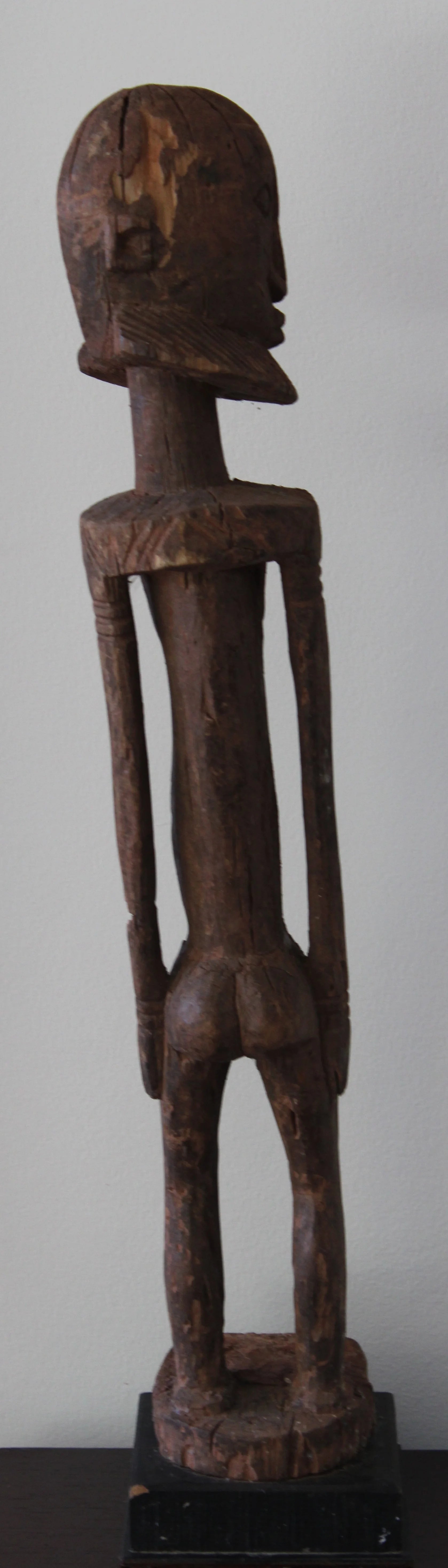 Interesting Dogon figure called "Nommo Shicouroulé," a man in a prayer position or pose and "niongom" style: characterized by the use of the natural form of the wood (branch or root), something infrequent in African statuary, the male character is shown leaning back and with his face completely tilted to the right, showing his profile. The figure carved from a branch or root results in a very elongated form, with its straight arms and flattened hands pressed to the thighs. It has body scarifications, especially noticeable in the area of the bulging belly, with a very pronounced navel. These images are characterized by the schematism of the features and the angular and rectilinear profiles, showing a great sense of verticality and it is frequent, as in this case, that they need a platform to achieve stability, often eliminating the feet.