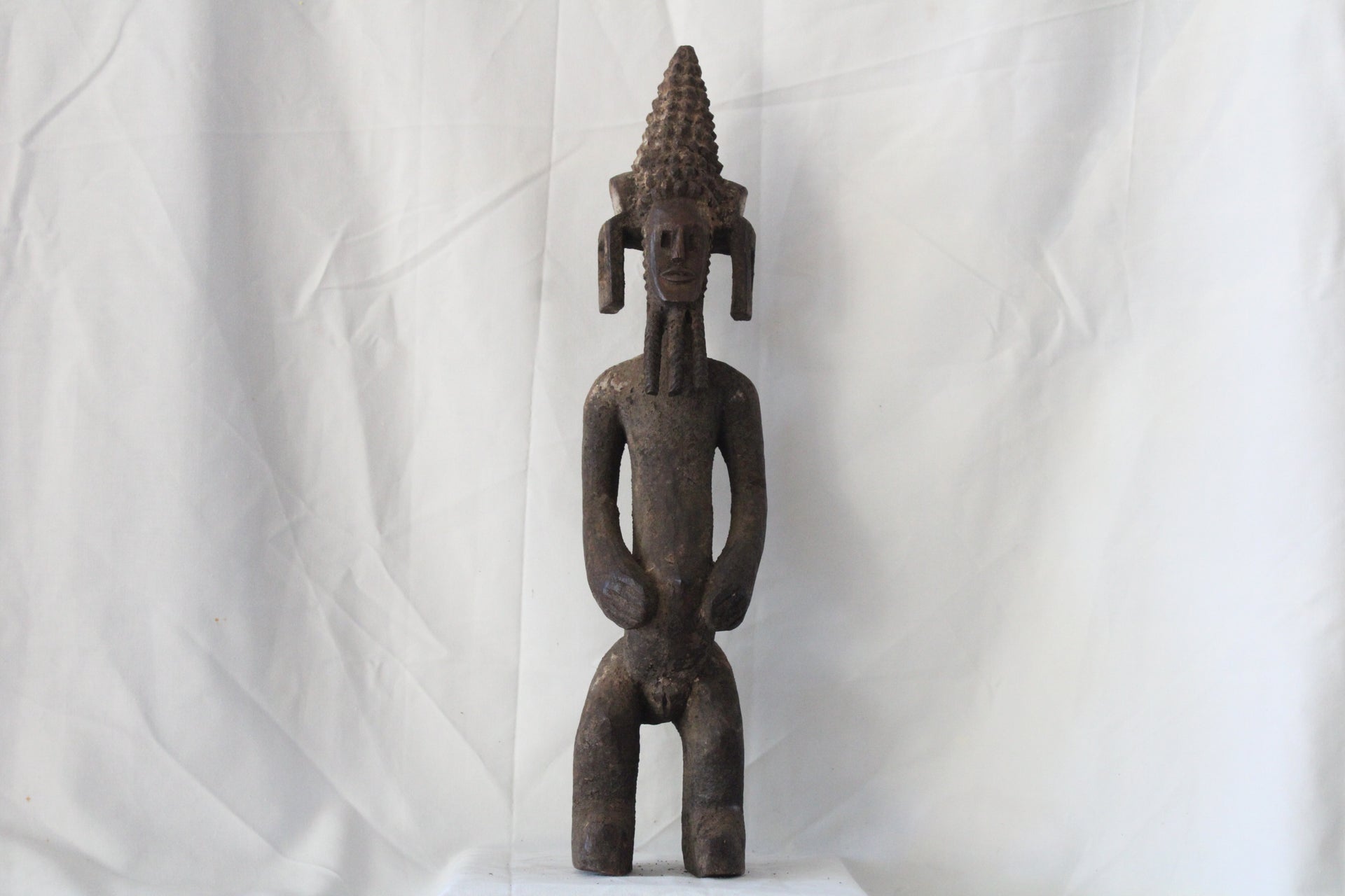 Esta escultura antropomorfa de la etnia Jukun, originaria de Nigeria, refleja la profunda espiritualidad de su pueblo. La figura, de pie y de proporciones robustas y geometrizadas, tiene un rostro con ojos rectangulares y una boca cerrada que transmite una expresión hierática. El tocado cónico, elevado y con proyecciones laterales, refuerza la monumentalidad de la representación. La ausencia de rasgos anatómicos definidos, especialmente en el sexo, otorga ambigüedad de género y potencia su carácter simbólico, convirtiéndola en un mediador entre la comunidad y el mundo de los espíritus. Su gesto de manos sobre el vientre evoca la fertilidad y la continuidad de la vida.