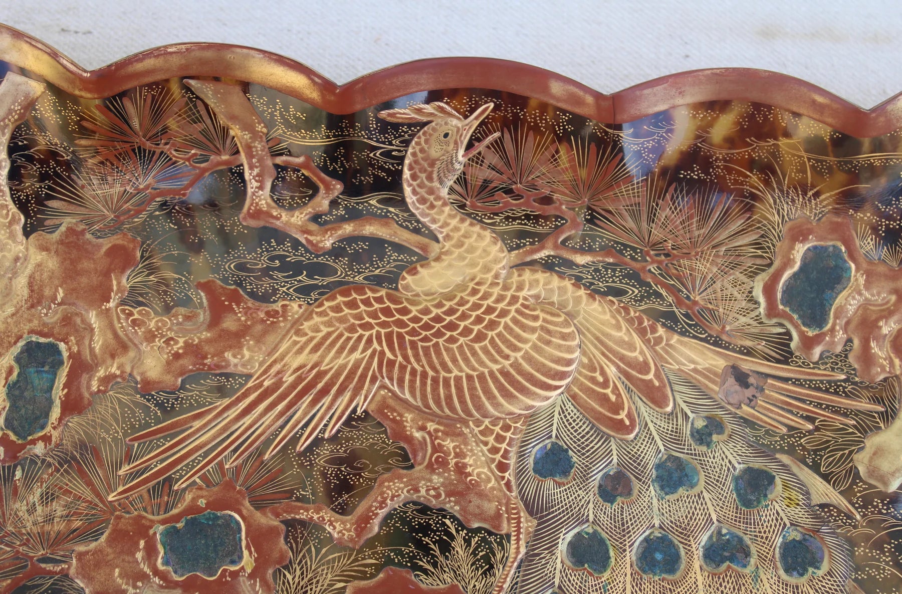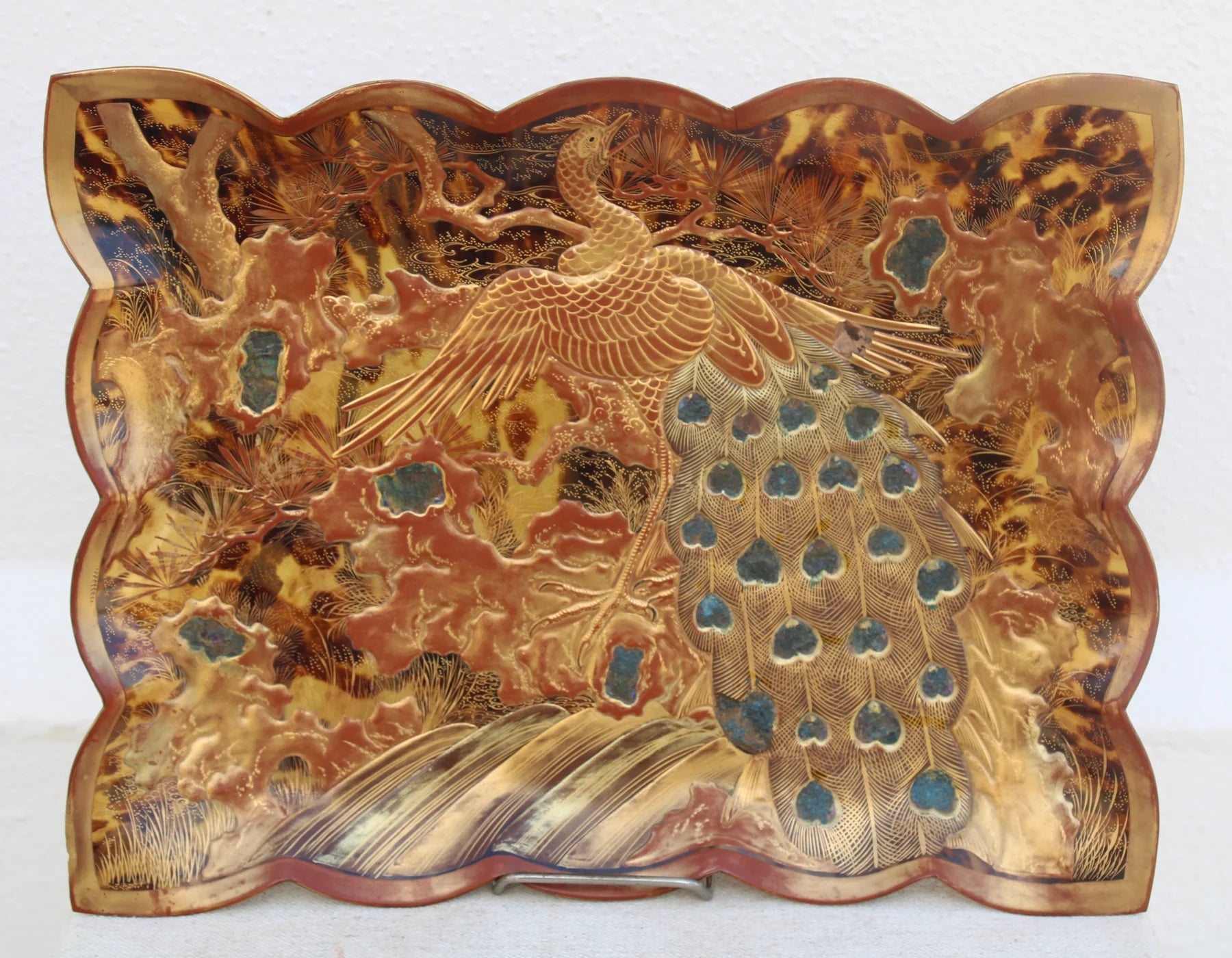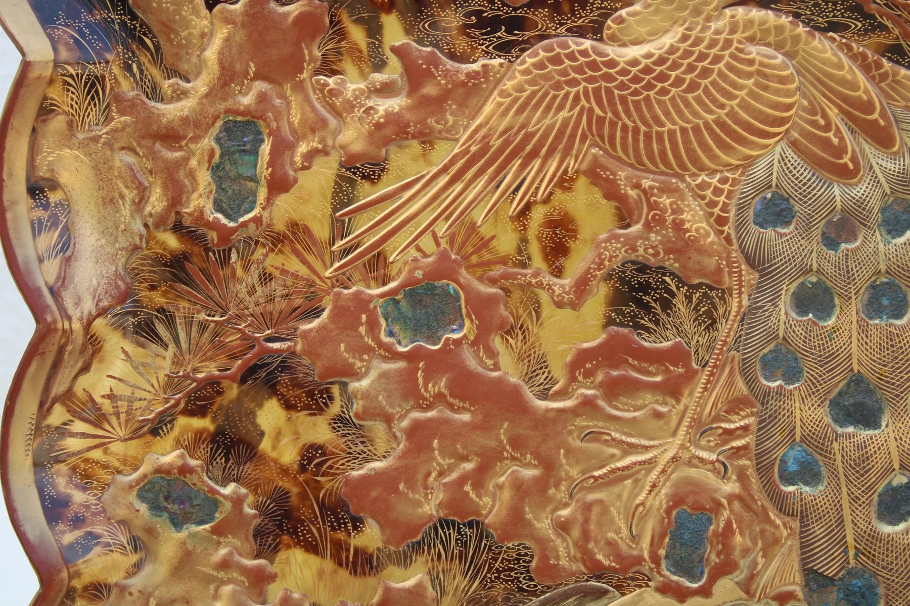 Esta bandeja japonesa del período Meiji destaca por su elegante forma rectangular y bordes convexos, con una escena de pavo real realizada en Maki-e de oro en relieve y detalles en azul profundo.