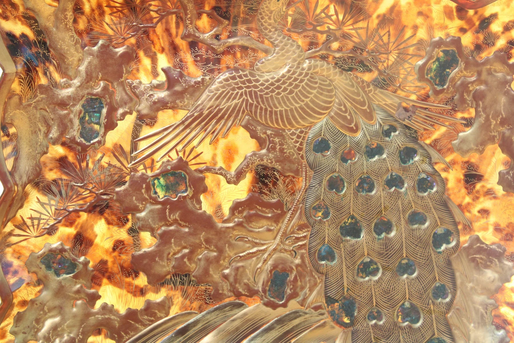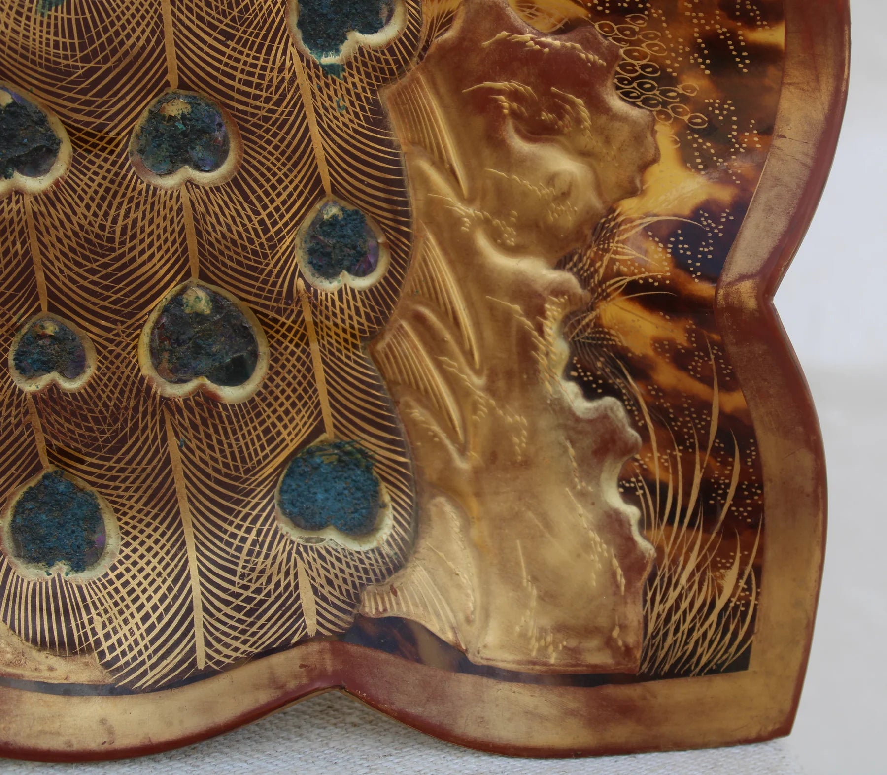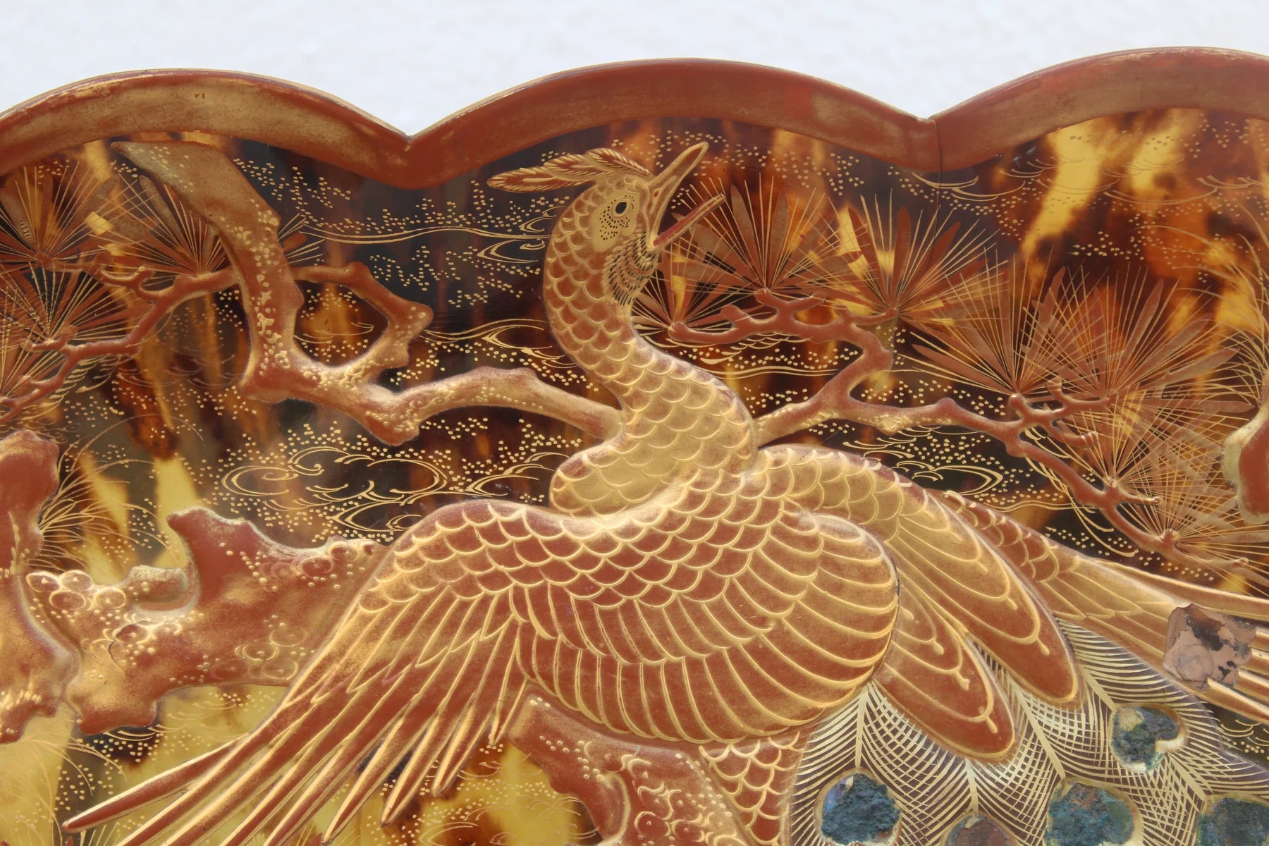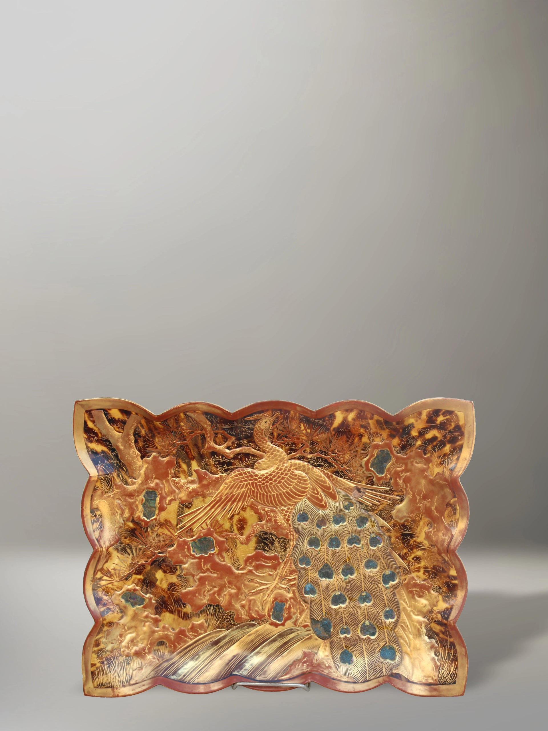 Esta bandeja japonesa del período Meiji destaca por su elegante forma rectangular y bordes convexos, con una escena de pavo real realizada en Maki-e de oro en relieve y detalles en azul profundo.