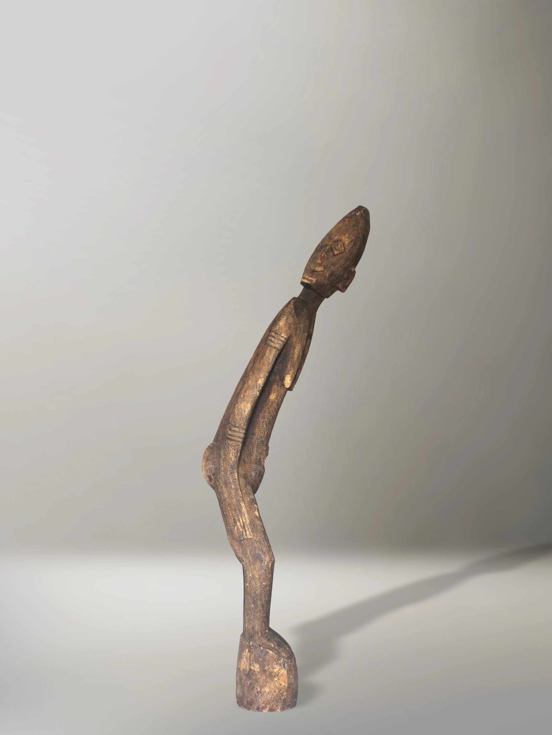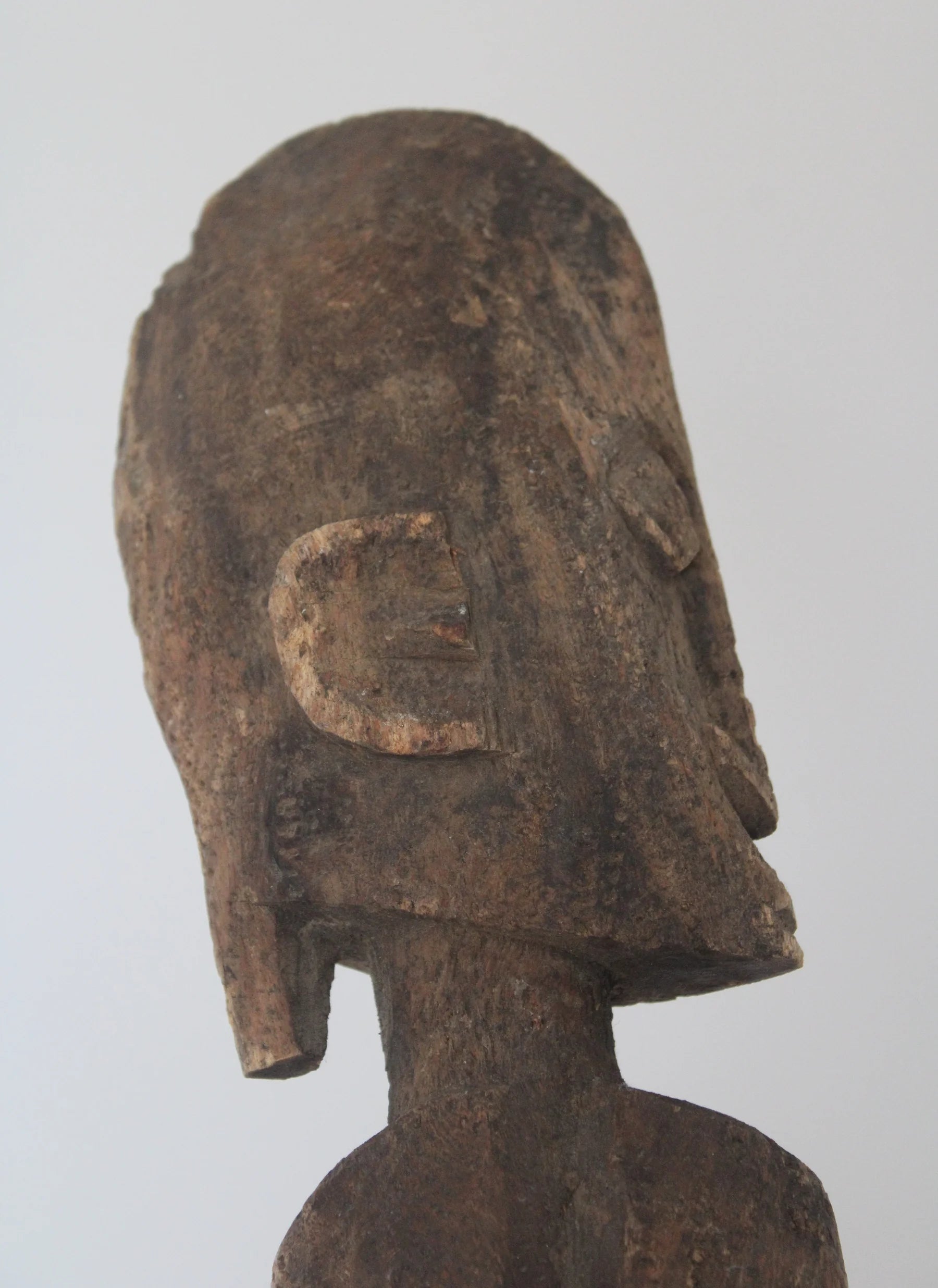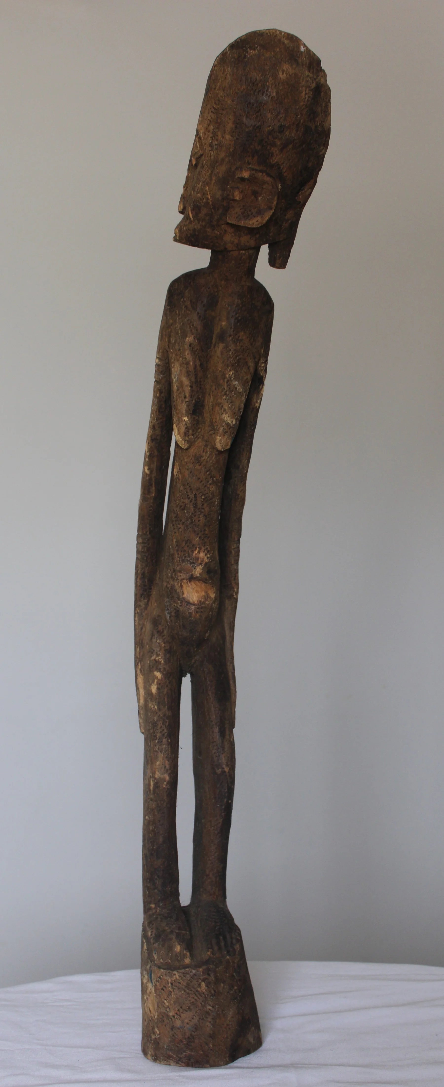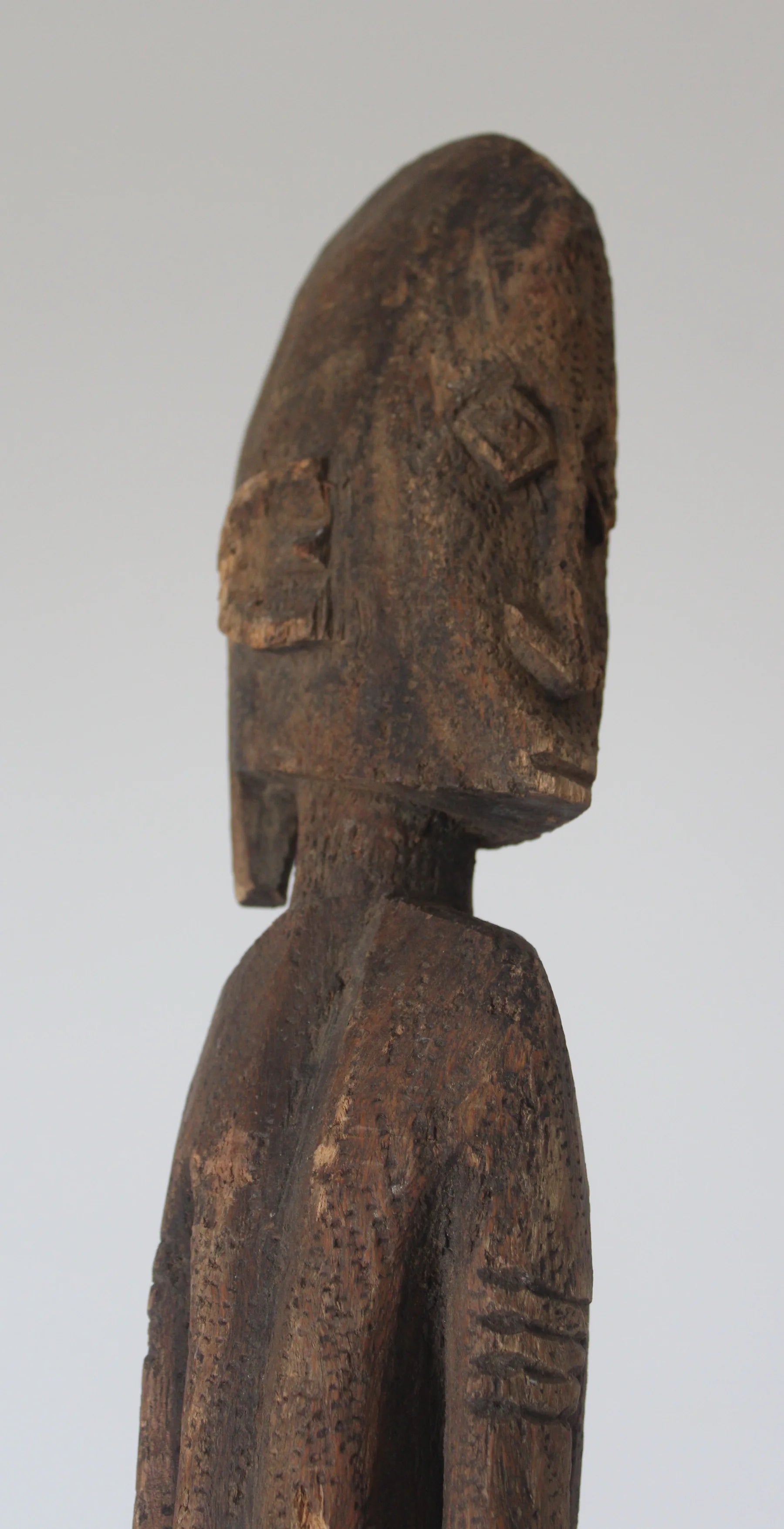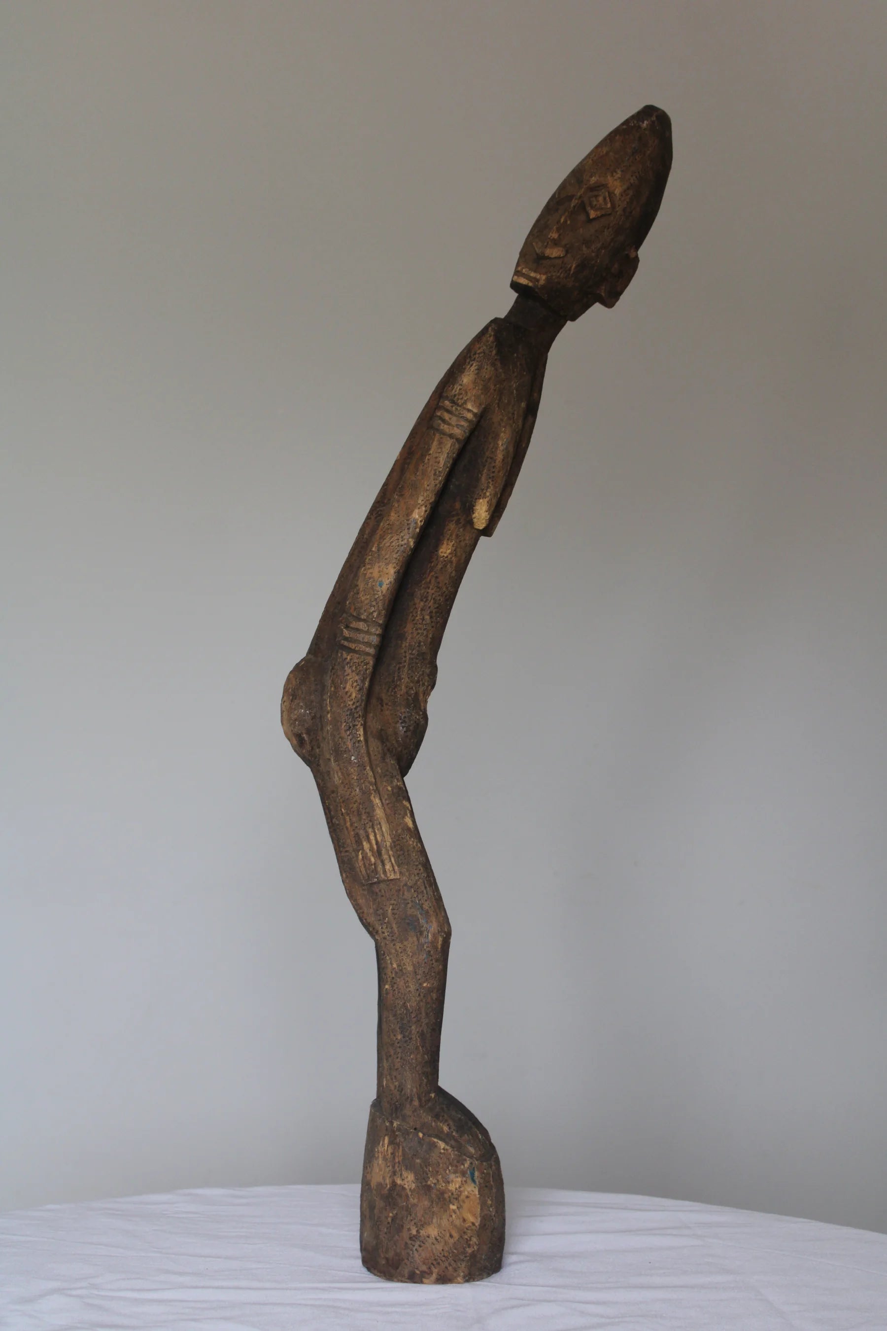 Extraordinaria figura dogón tallada en madera, caracterizada por su forma alargada, inclinación simbólica y estilización geométrica.
