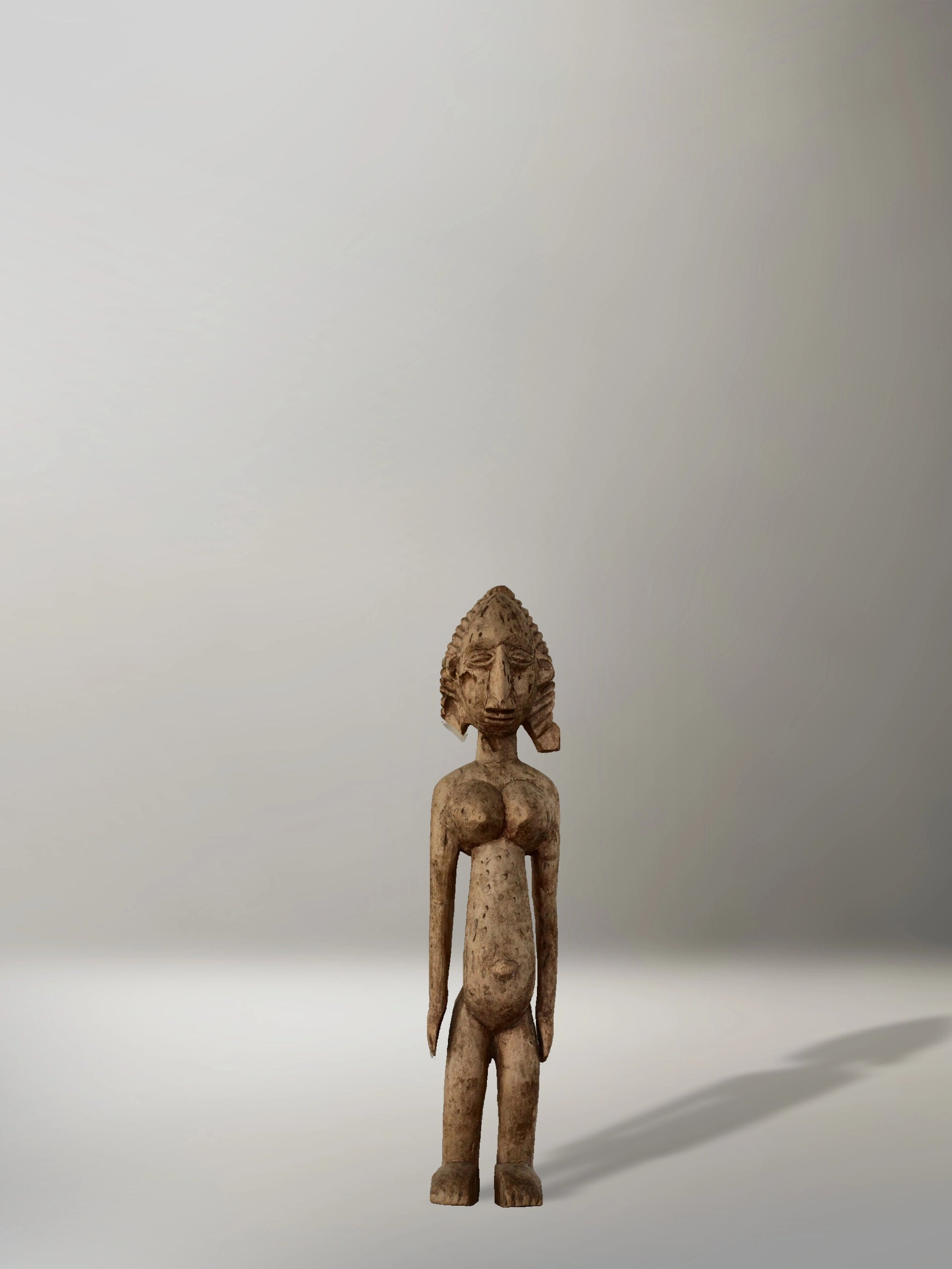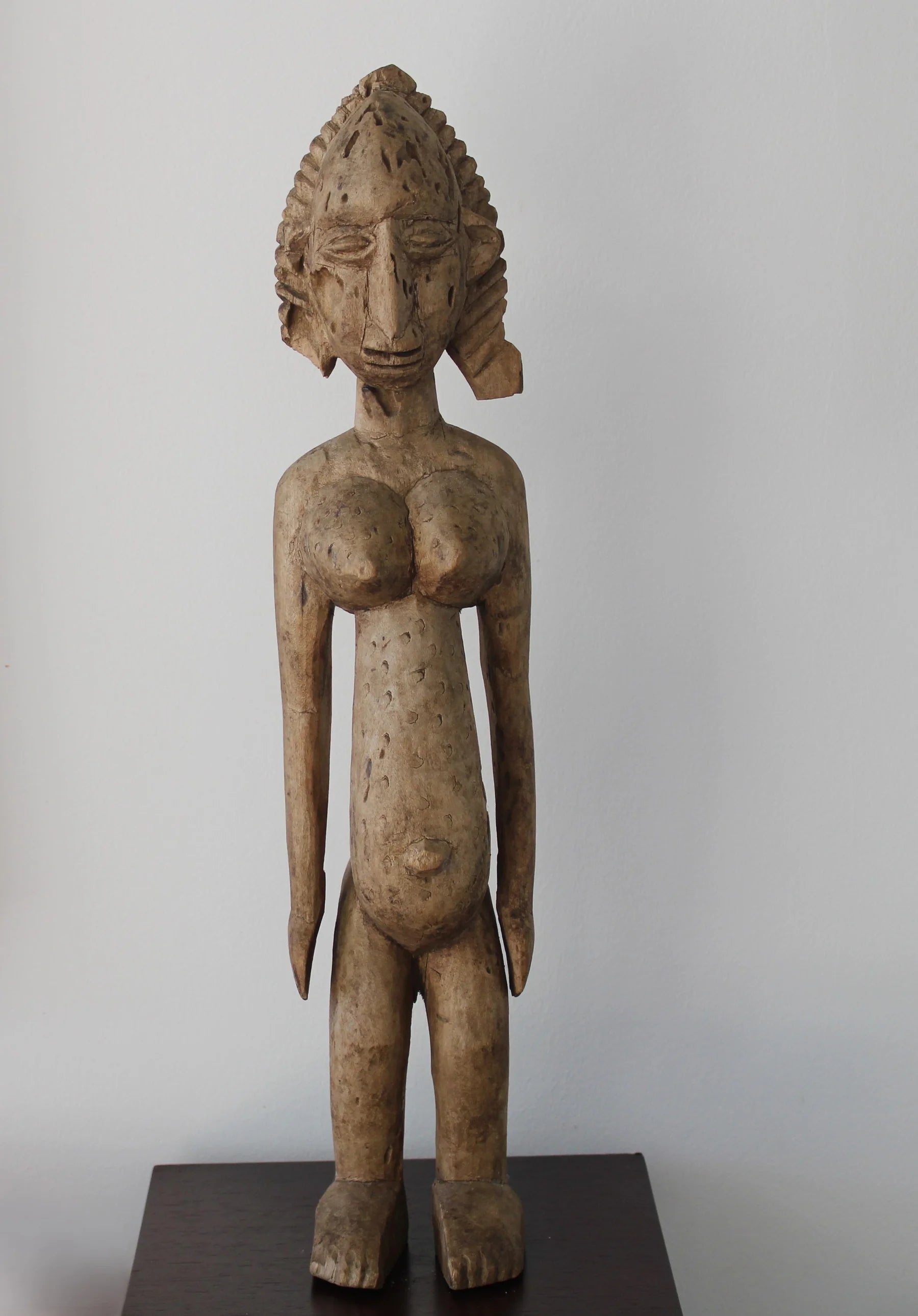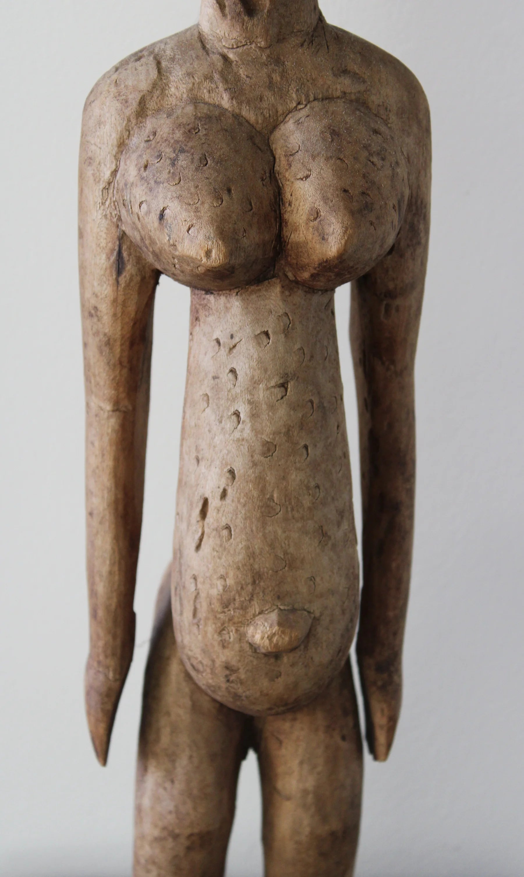 Esta escultura dogón representa una figura femenina con abdomen prominente, senos cónicos y glúteos marcados, mostrando escarificaciones en pecho y abdomen.