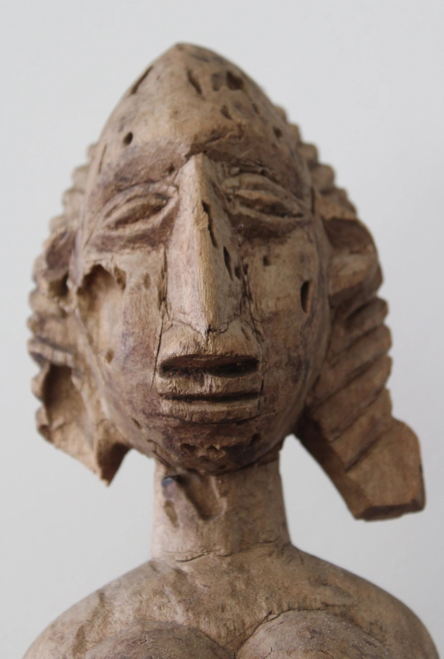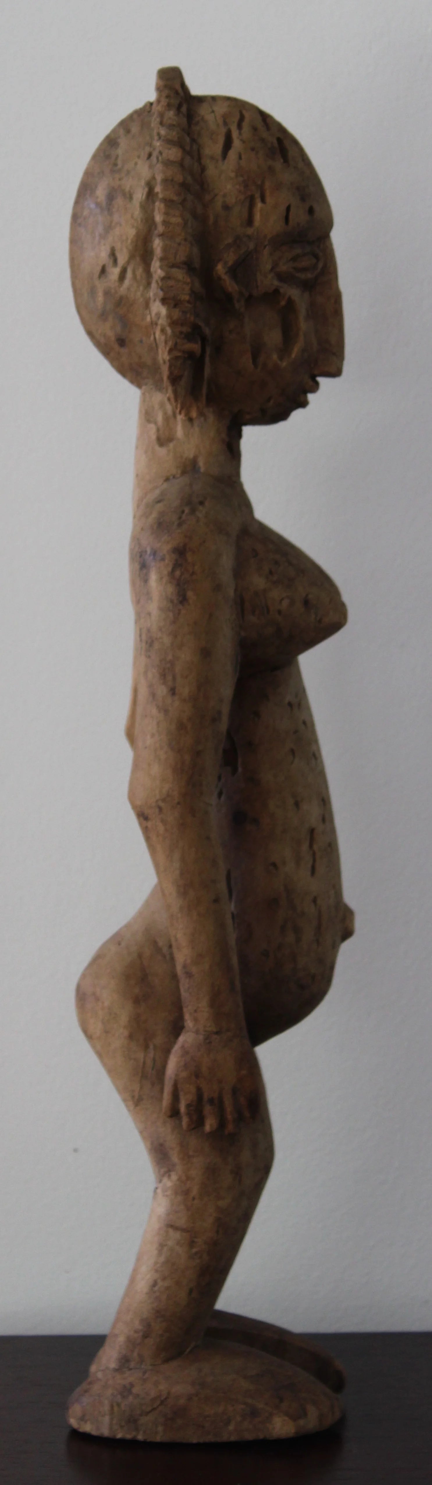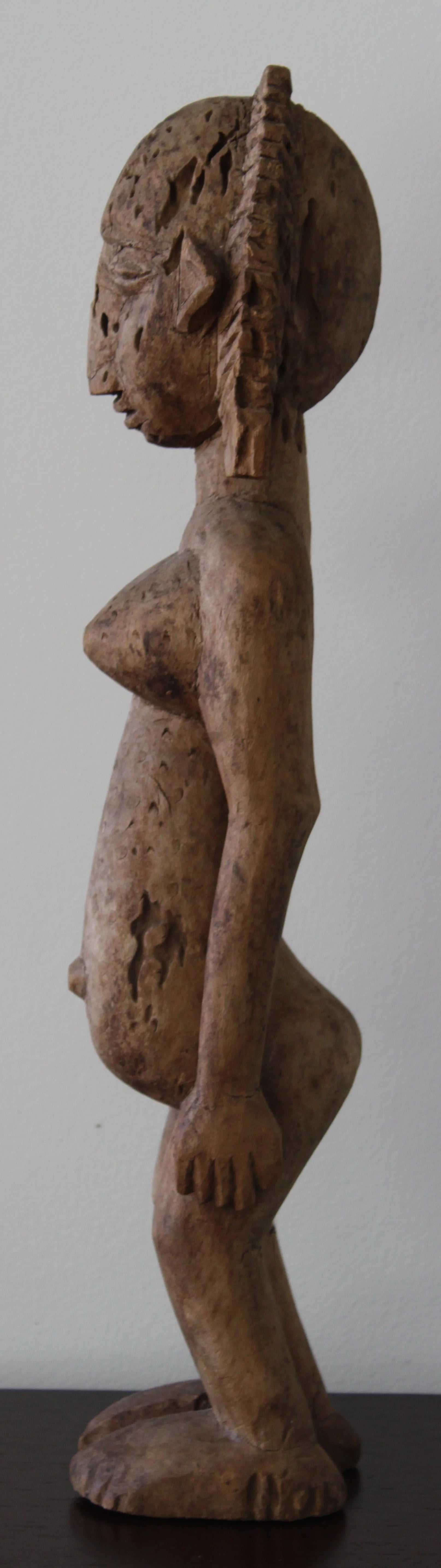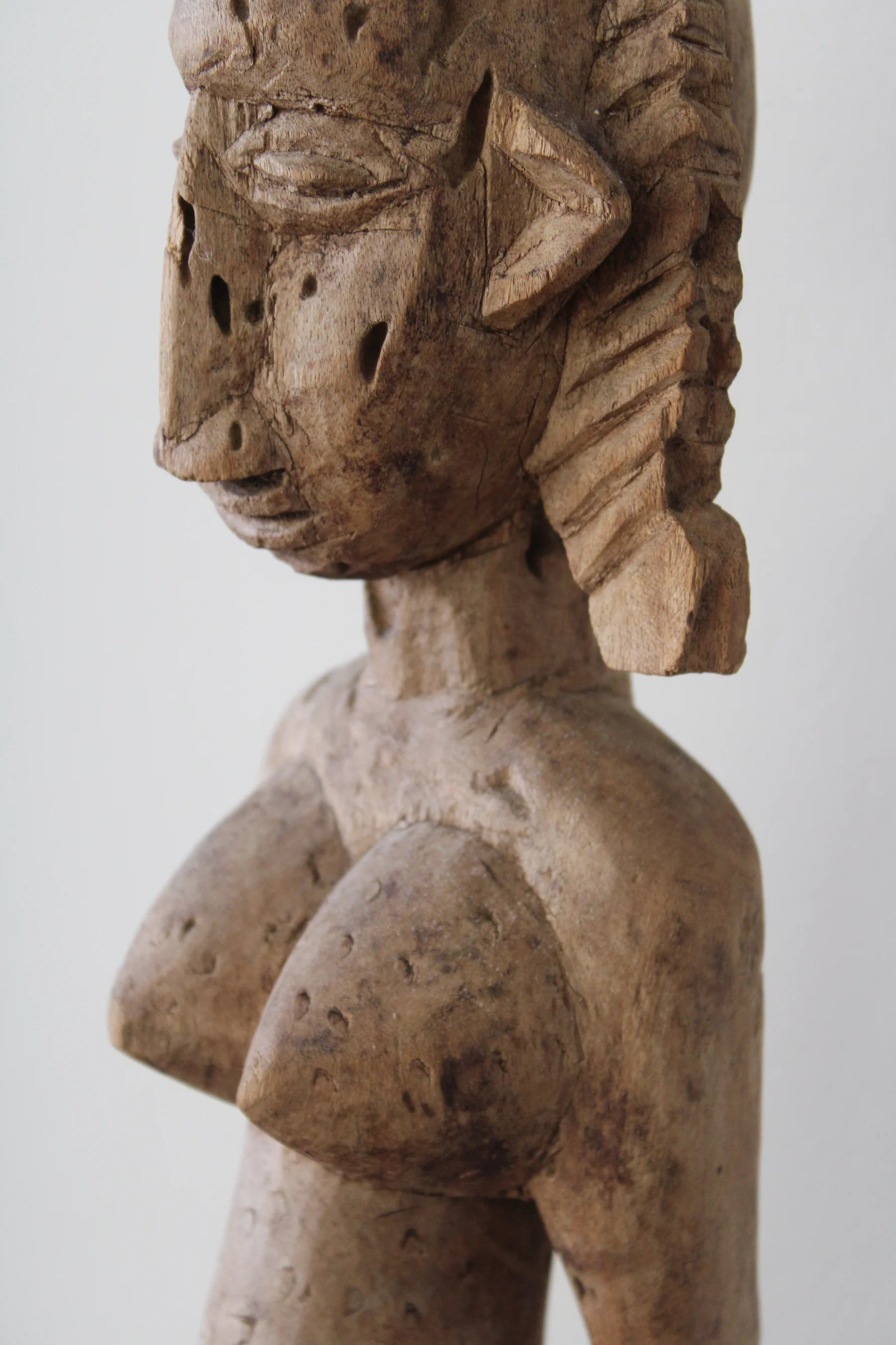 Esta escultura dogón representa una figura femenina con abdomen prominente, senos cónicos y glúteos marcados, mostrando escarificaciones en pecho y abdomen.