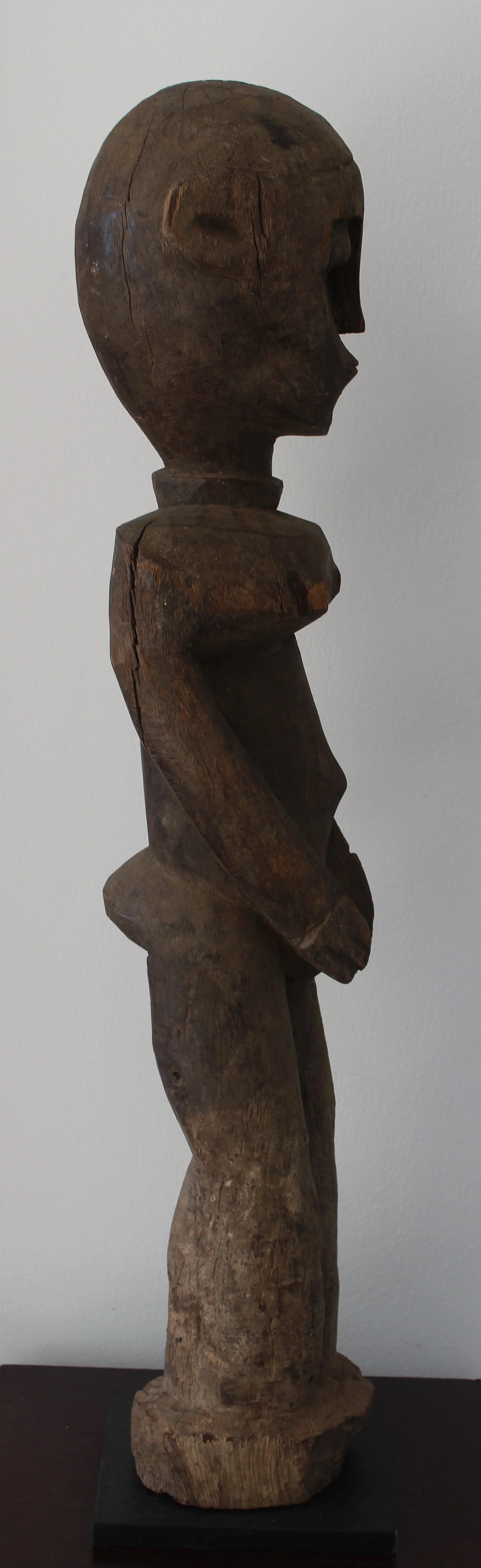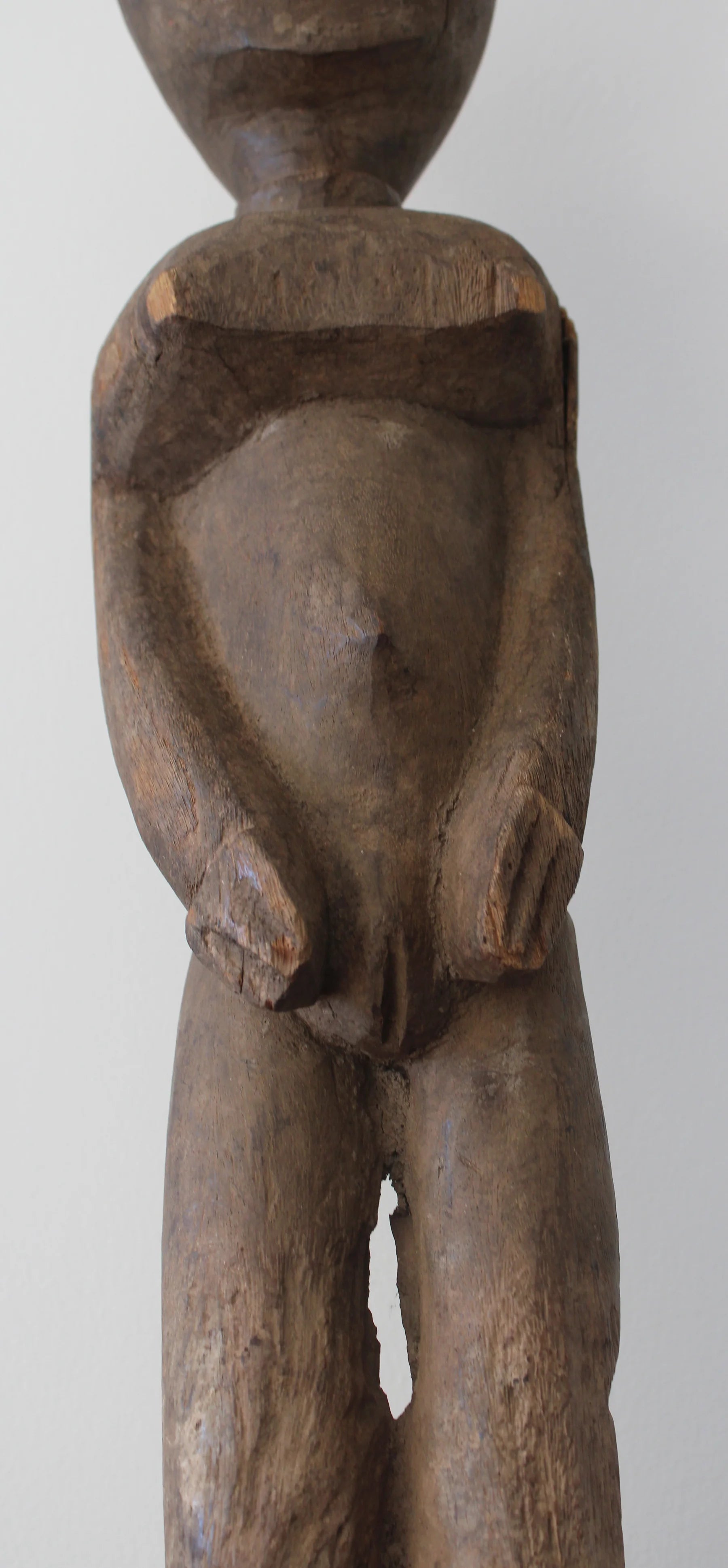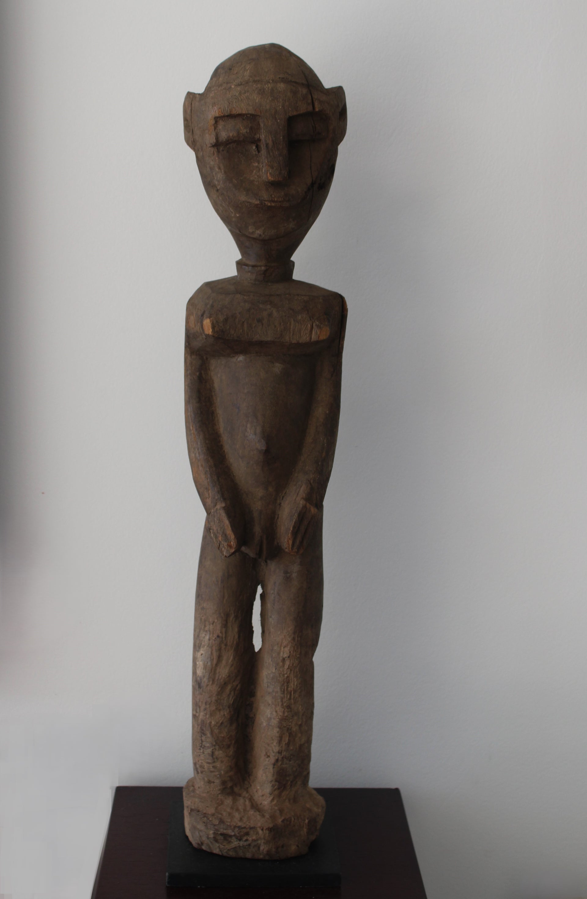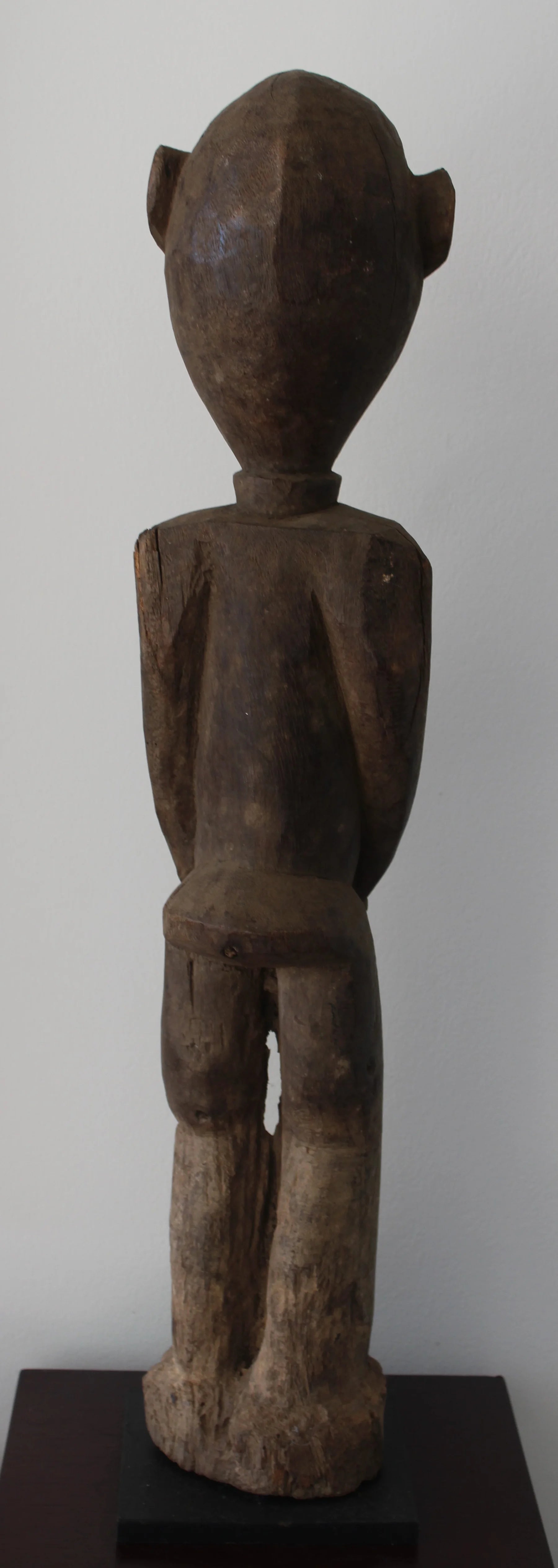 Esta Bateba femenina destaca por su diseño monolítico y reductivista, con piernas toscamente sugeridas, brazos que enmarcan la zona genital y una cabeza de rasgos irregulares y esquemáticos.