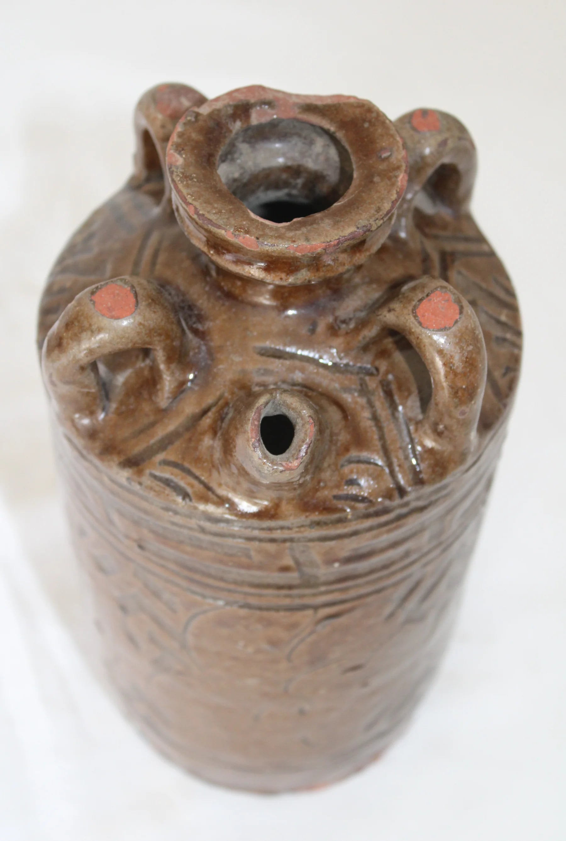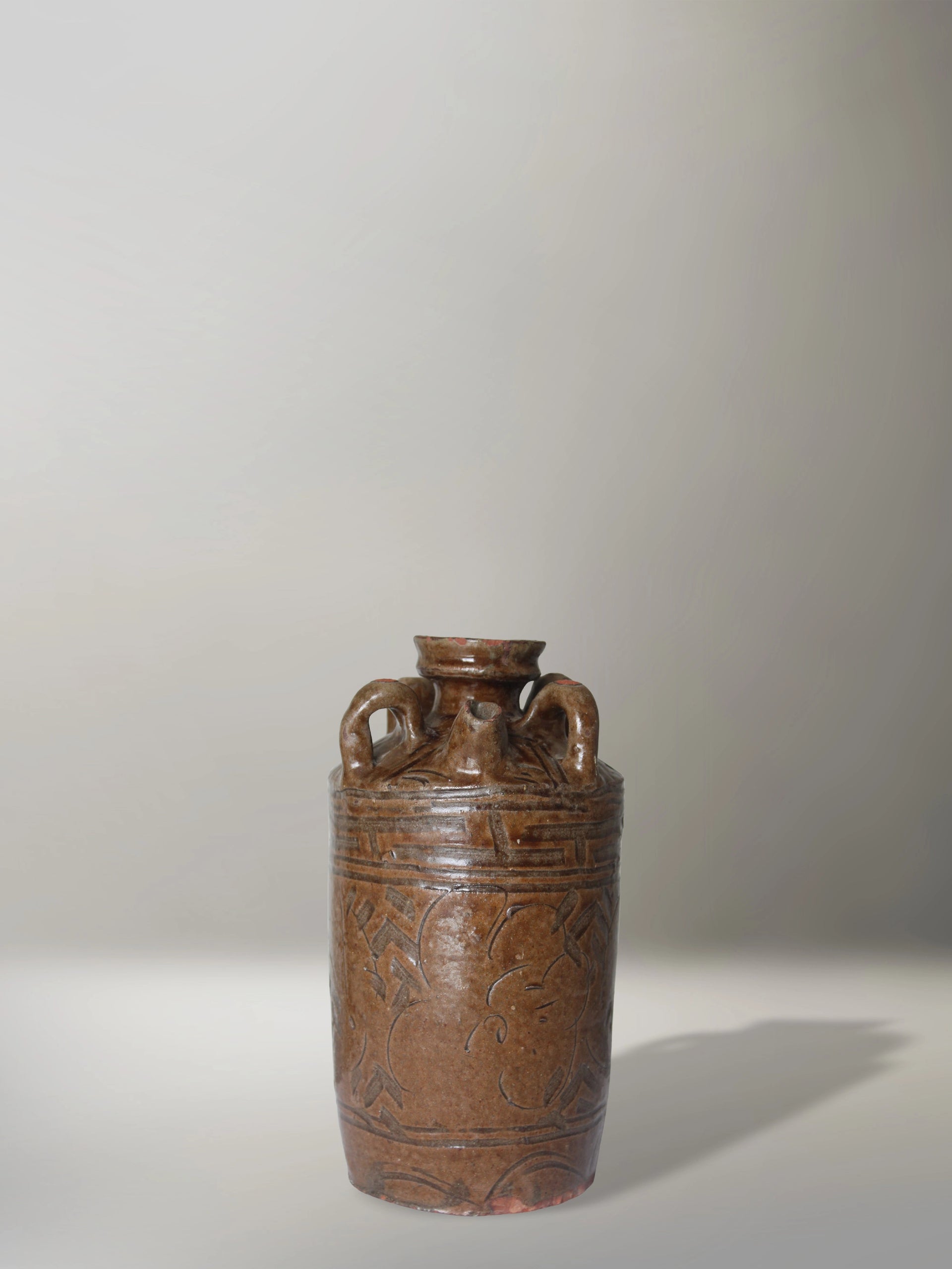 Esta jarra cilíndrica de cerámica vidriada, con cuatro asas y pico vertedor, presenta una decoración incisa de bandas con patrones geométricos y motivos vegetales estilizados.