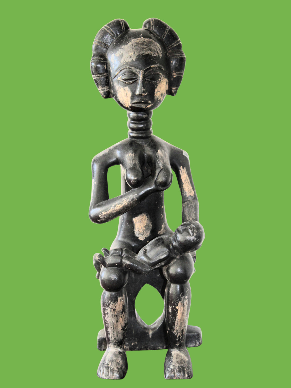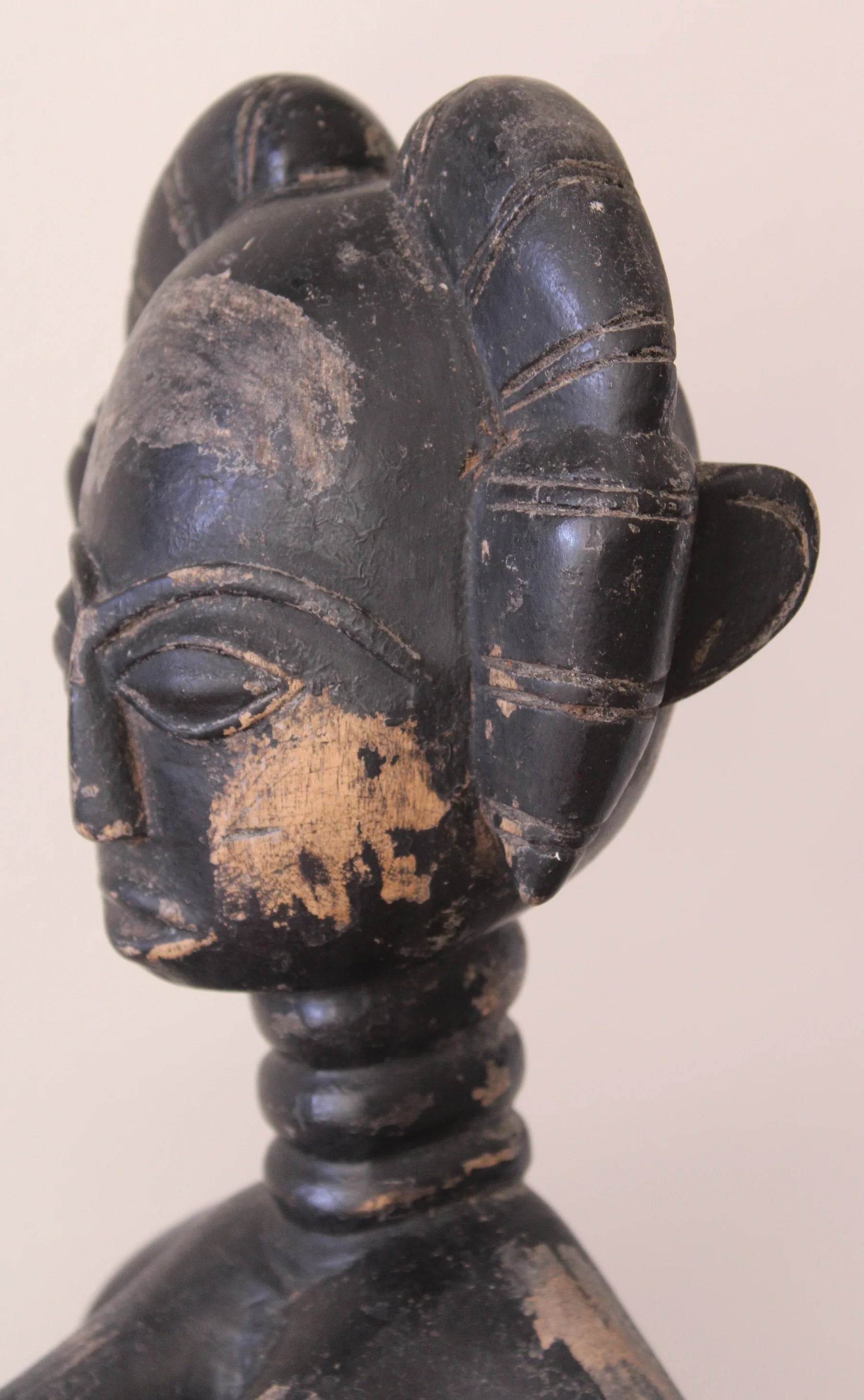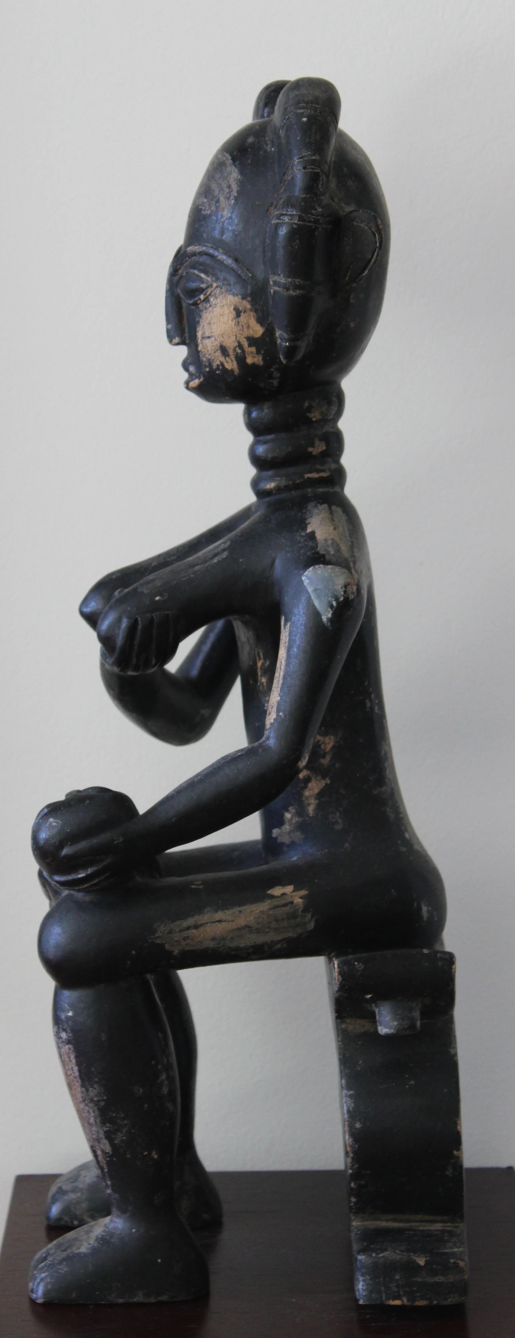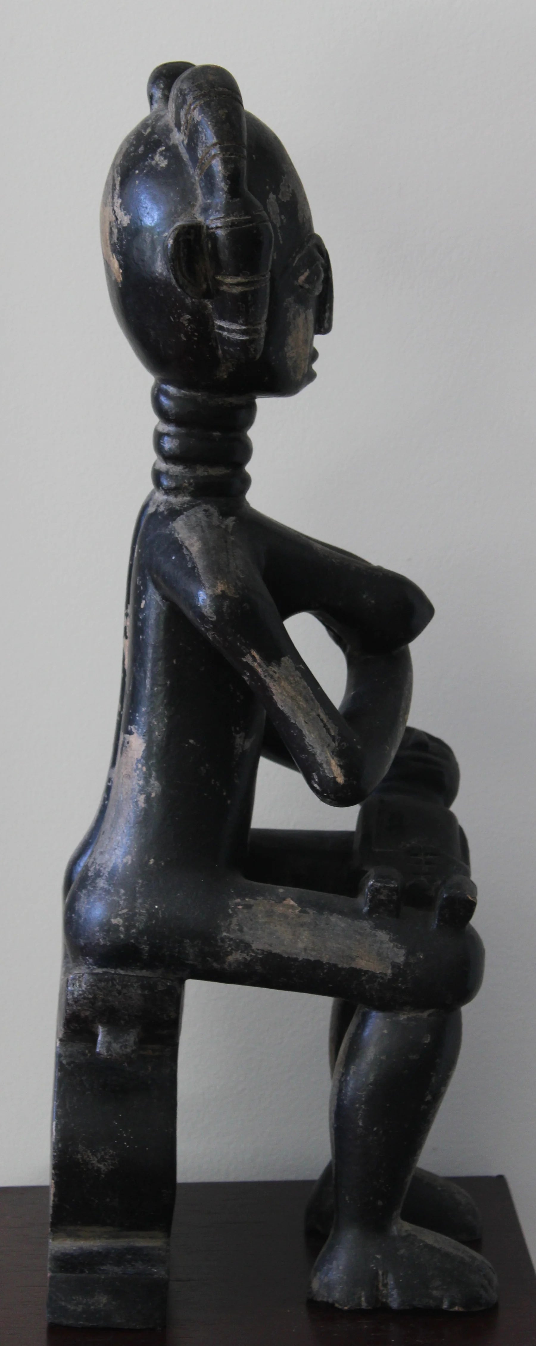 El peinado en vainas y el cuello anillado son detalles típicos de la estética Agni. El asiento curvo recuerda el arte cotidiano de los pueblos vecinos Ashanti.