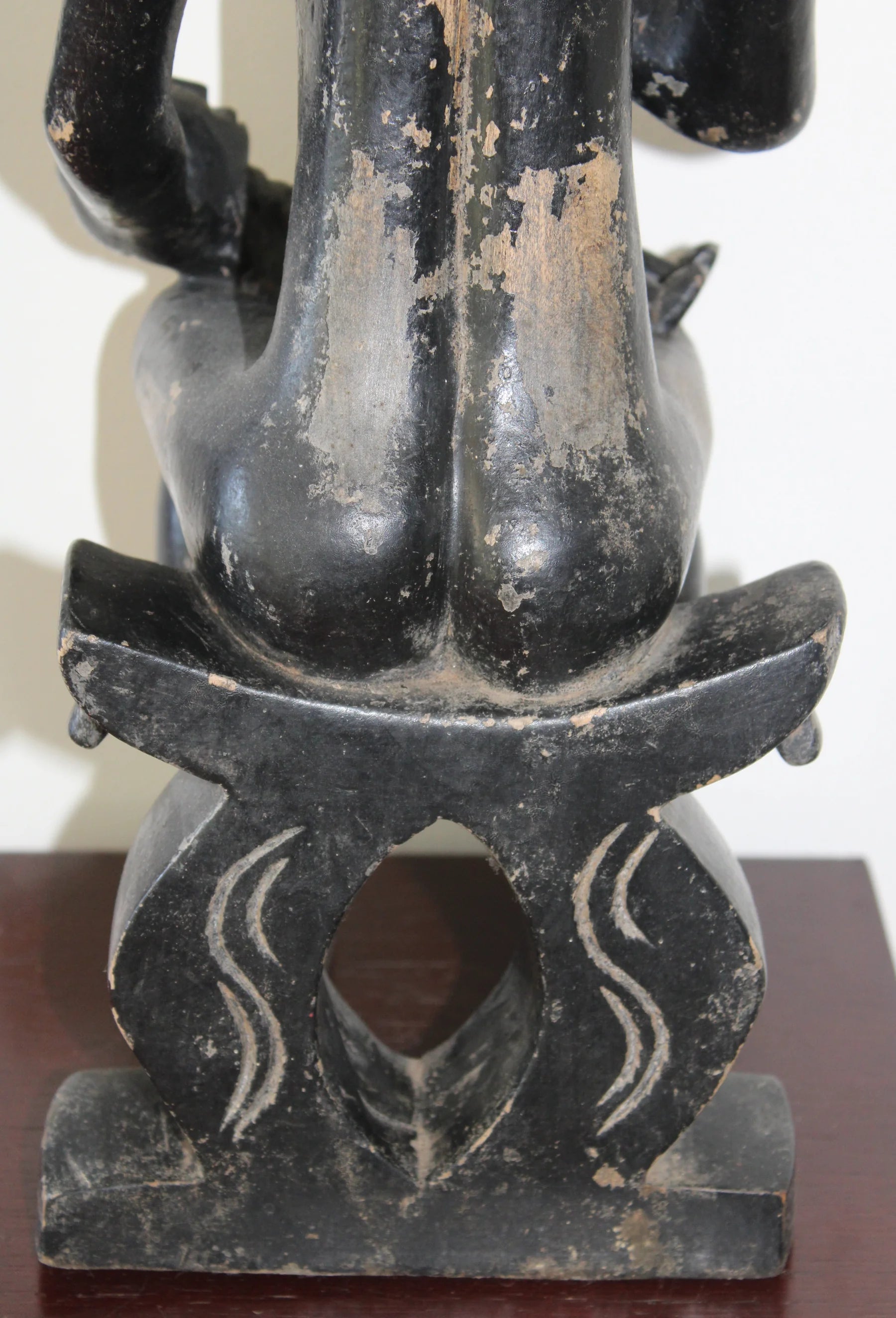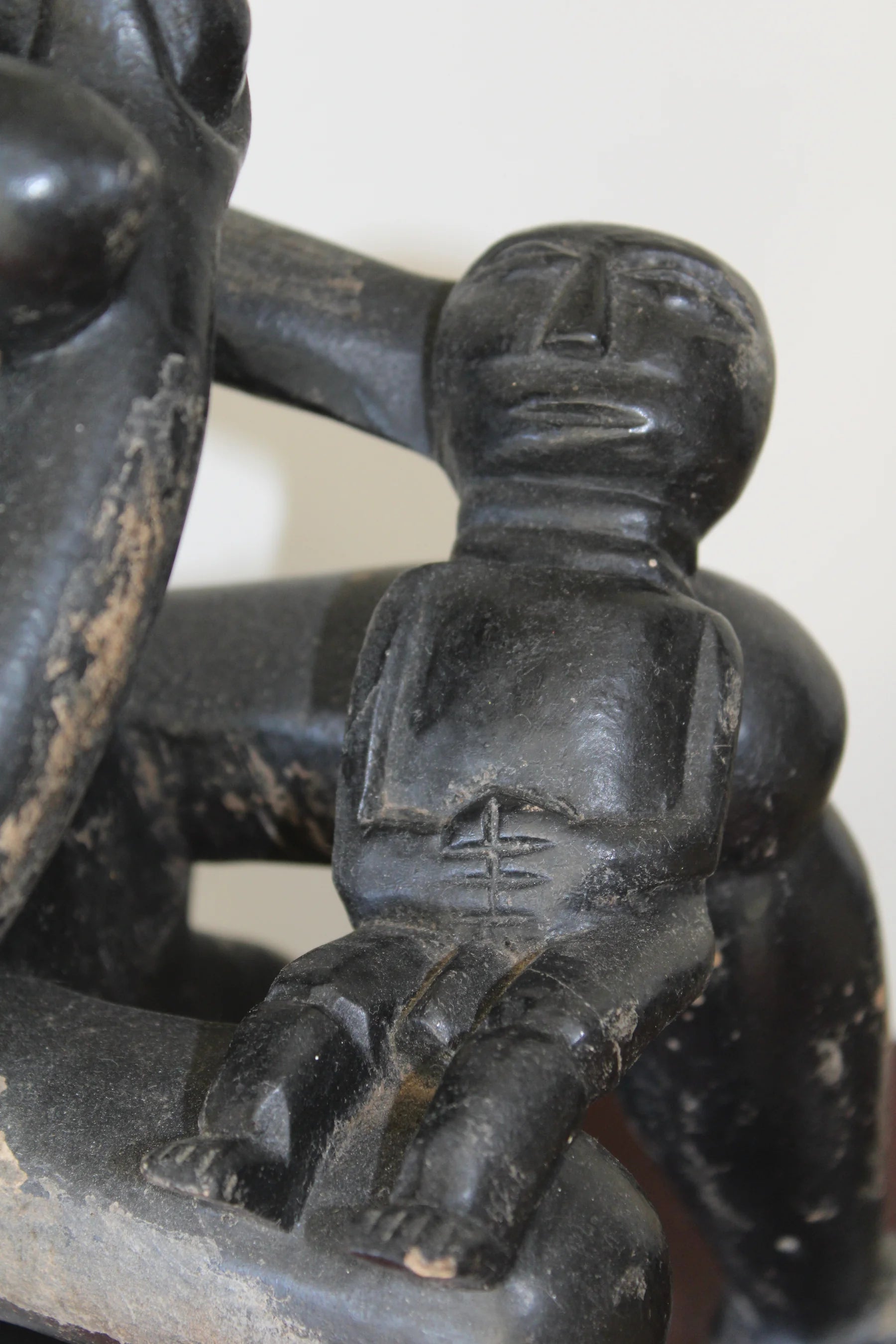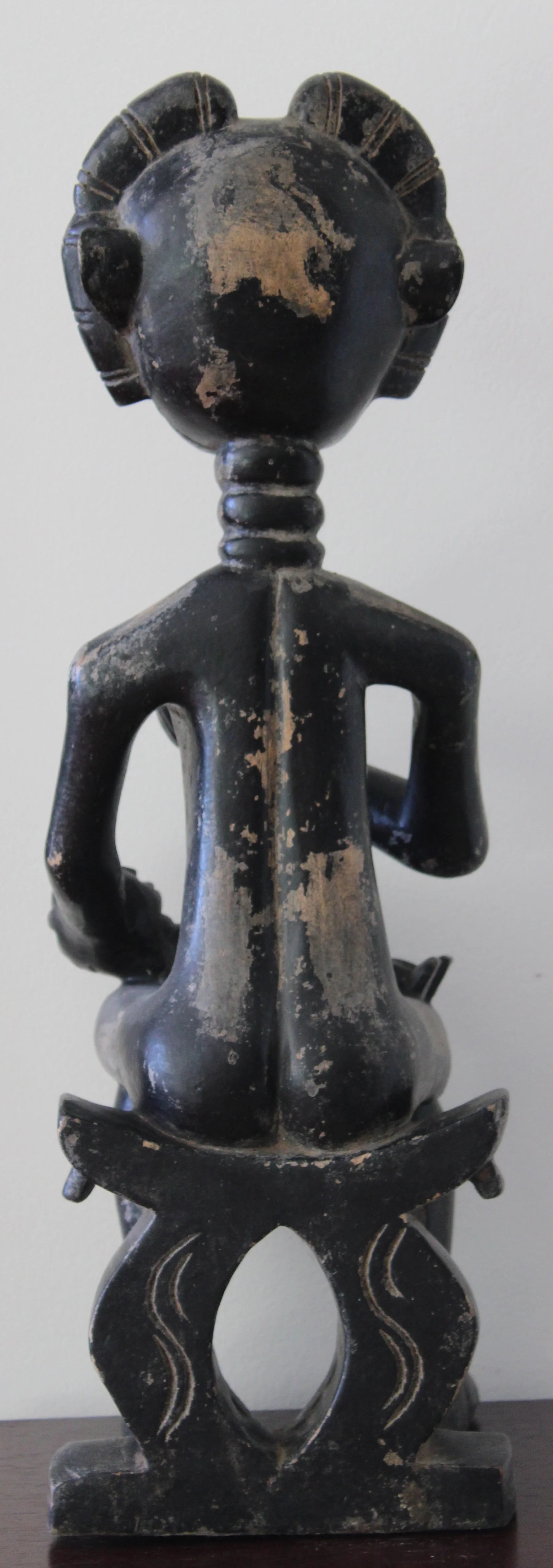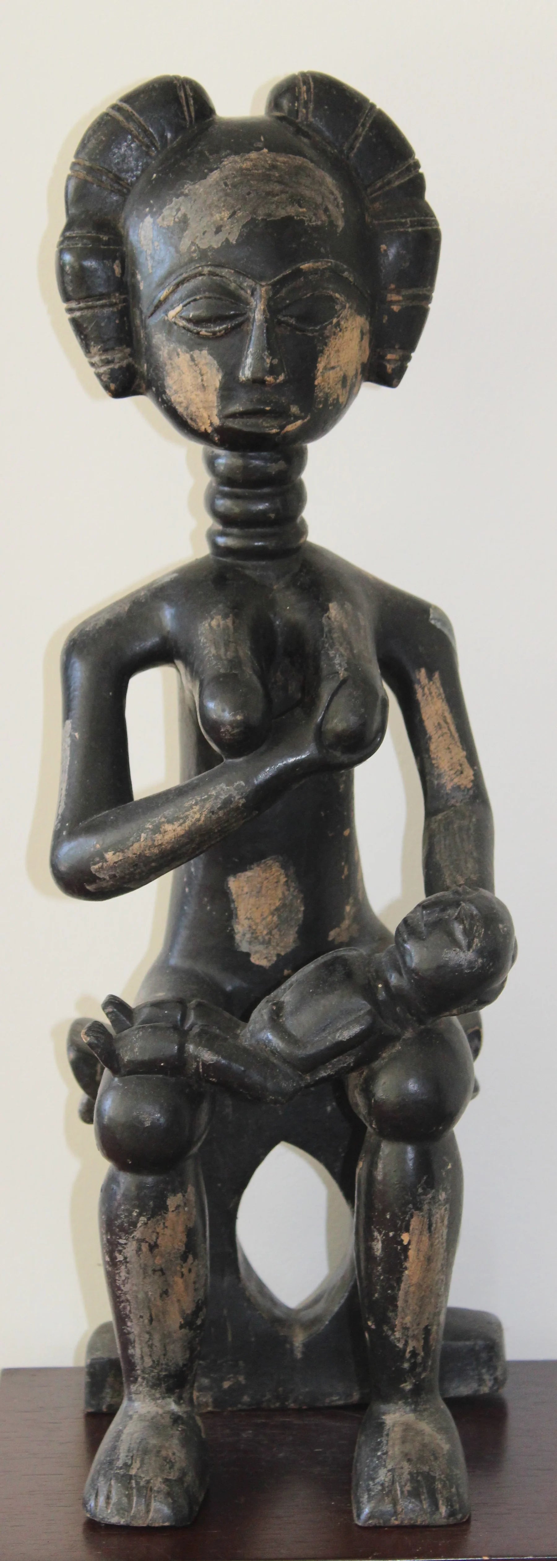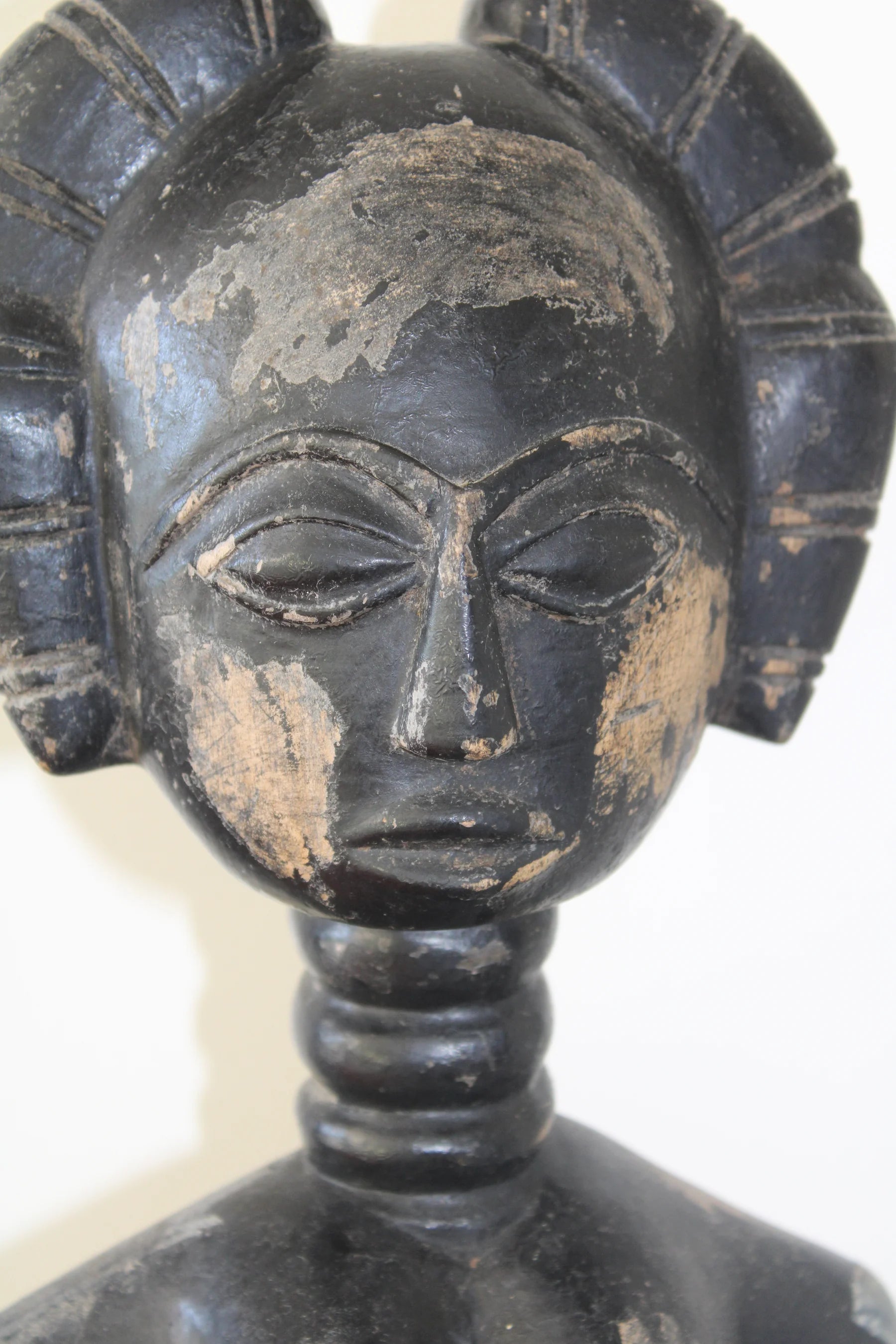 El peinado en vainas y el cuello anillado son detalles típicos de la estética Agni. El asiento curvo recuerda el arte cotidiano de los pueblos vecinos Ashanti.