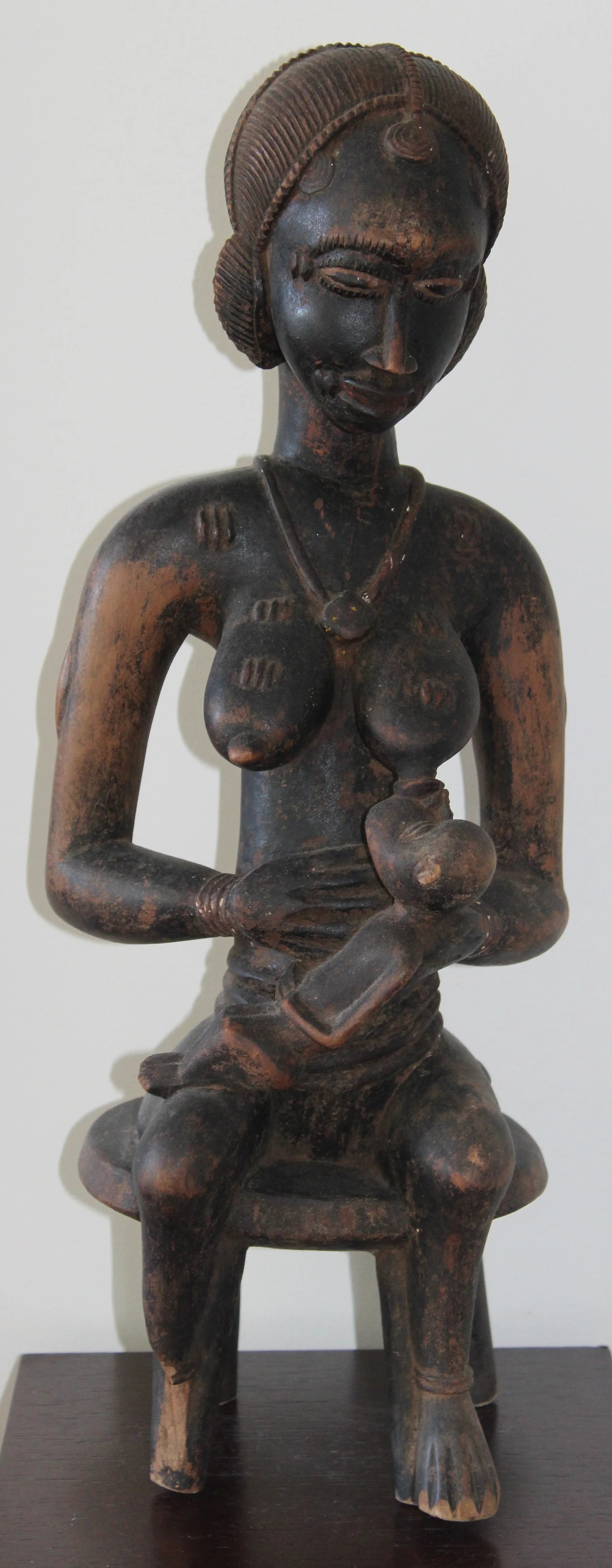 Destacada talla Baulé de Costa de Marfil, siglo XX, que muestra una madre amamantando a su hijo en un asiento circular.