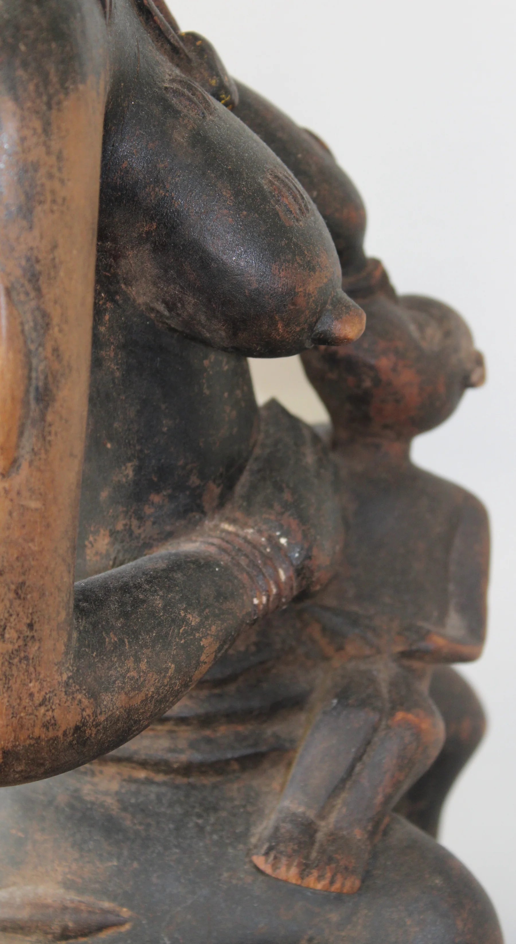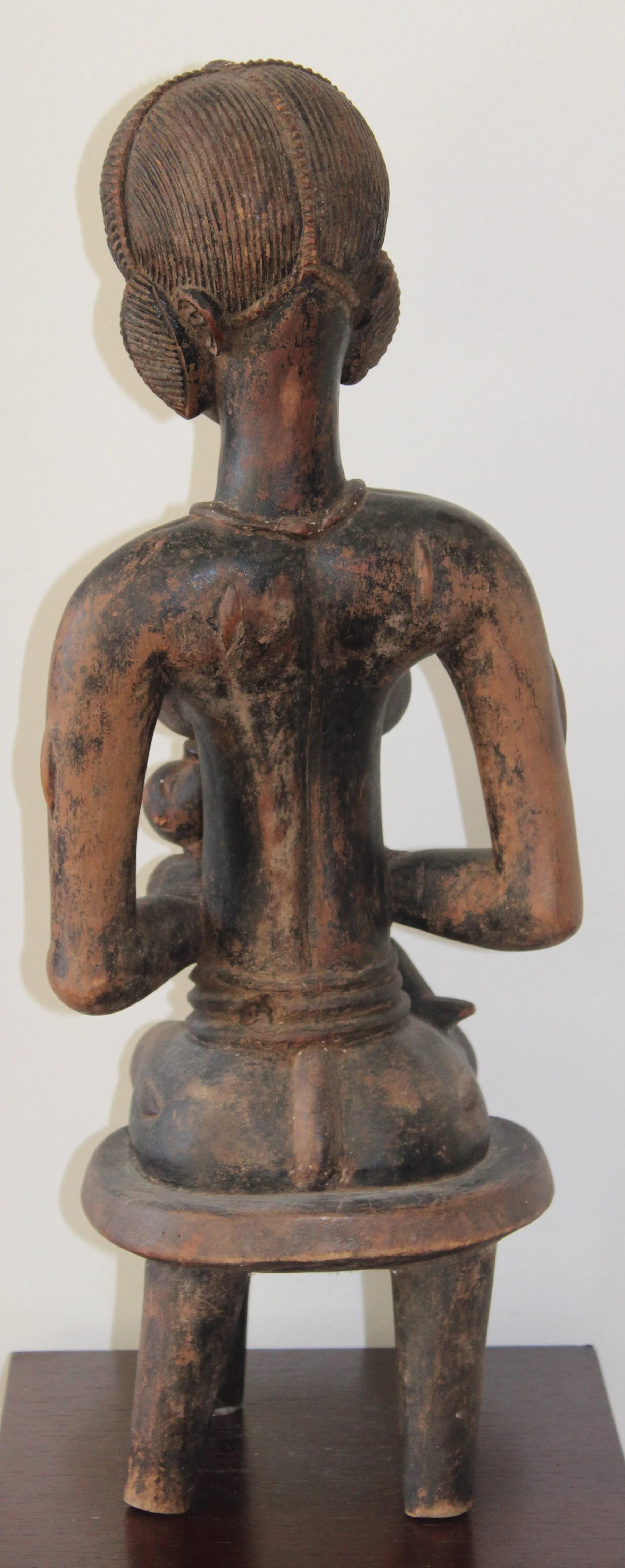 La pieza resalta por la interacción materno-filial, la delicadeza de las formas y los elaborados adornos, propios de la tradición Baulé. Su pátina oscura y detalles ornamentales subrayan la autenticidad y el alto rango cultural de la obra.