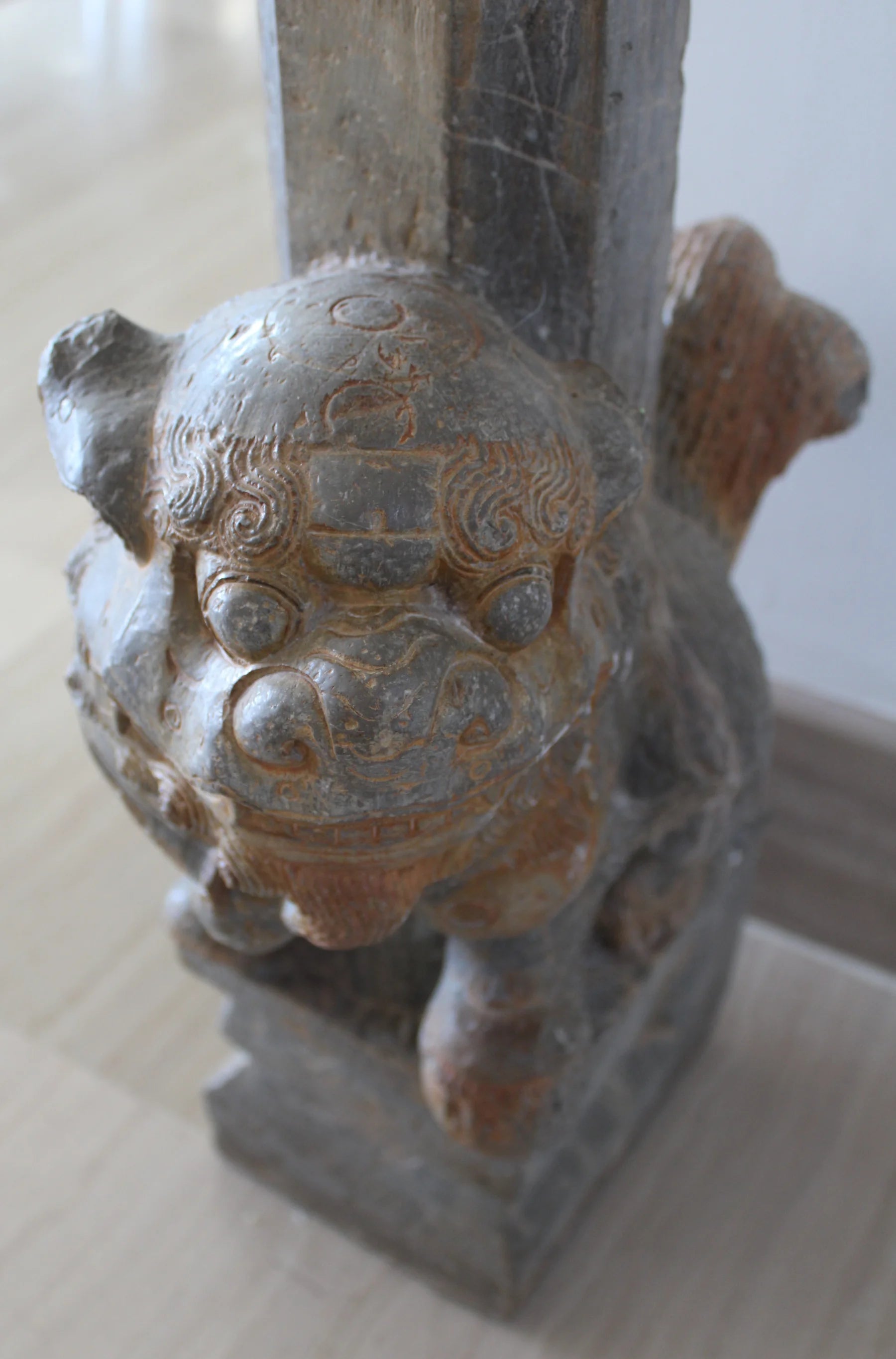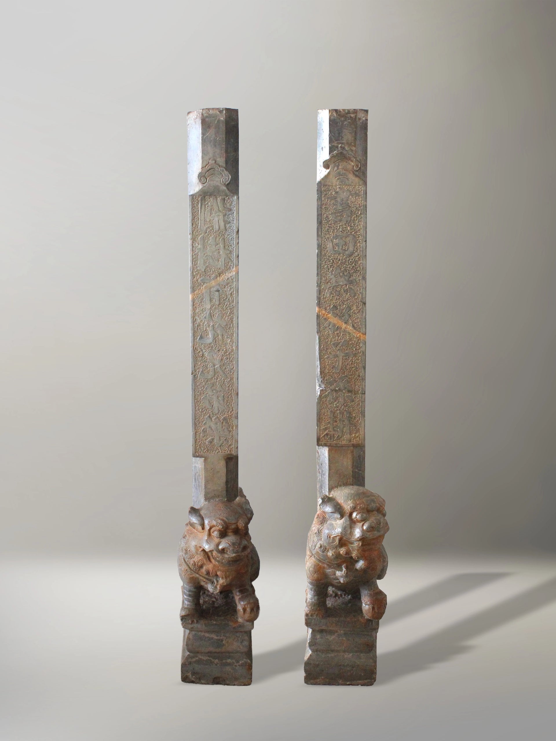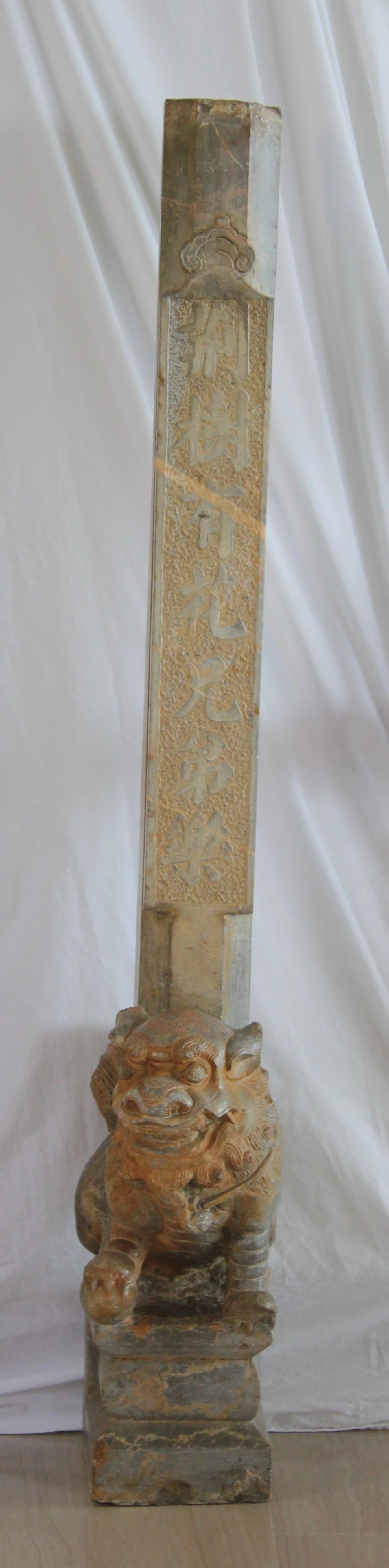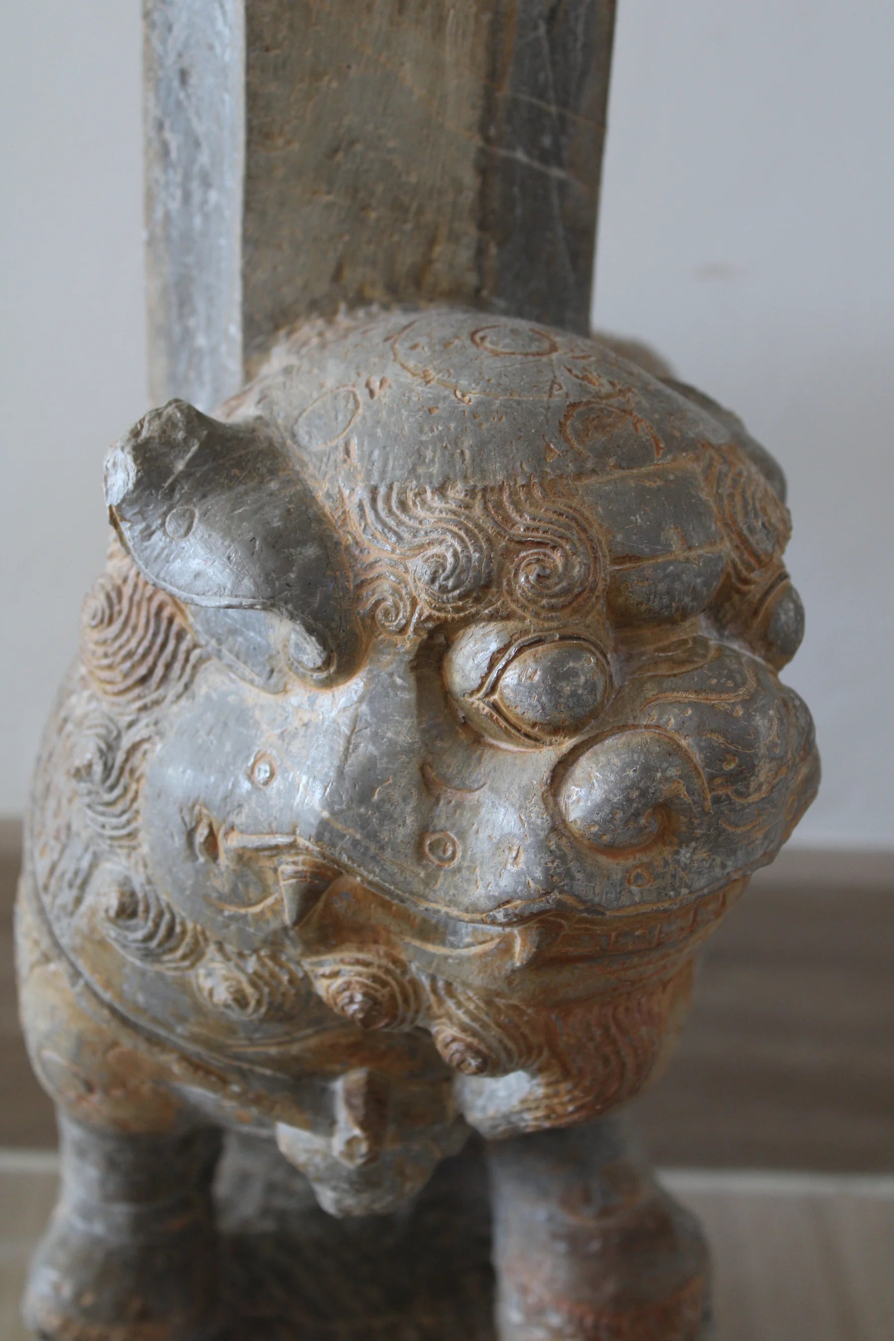 Conjunto de extraordinaria calidad, cada león musculoso y expresivo sostiene una estela con caracteres chinos sobre su espalda. Ricos detalles decorativos y posturas simbólicas realzan su impresionante presencia.