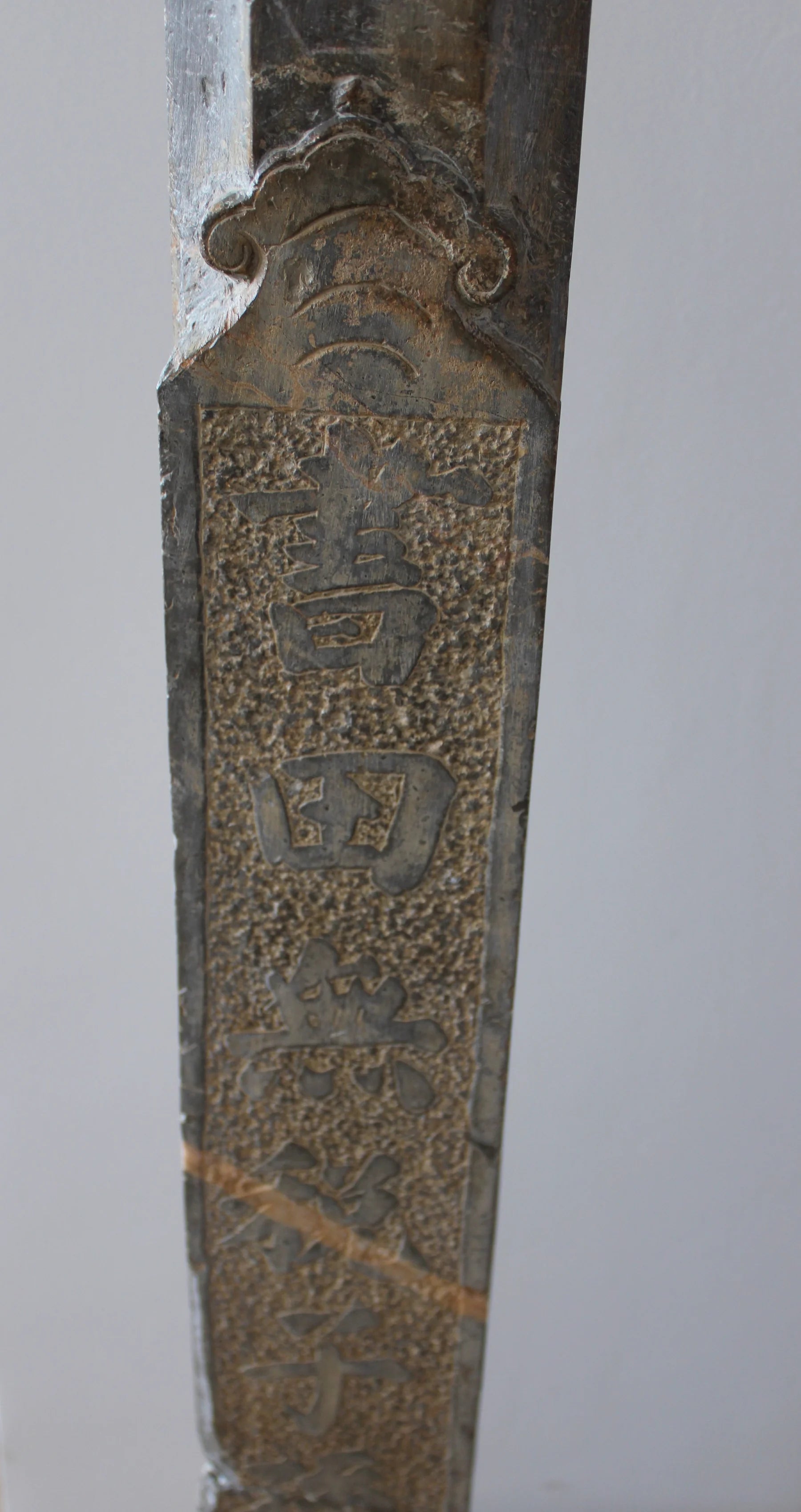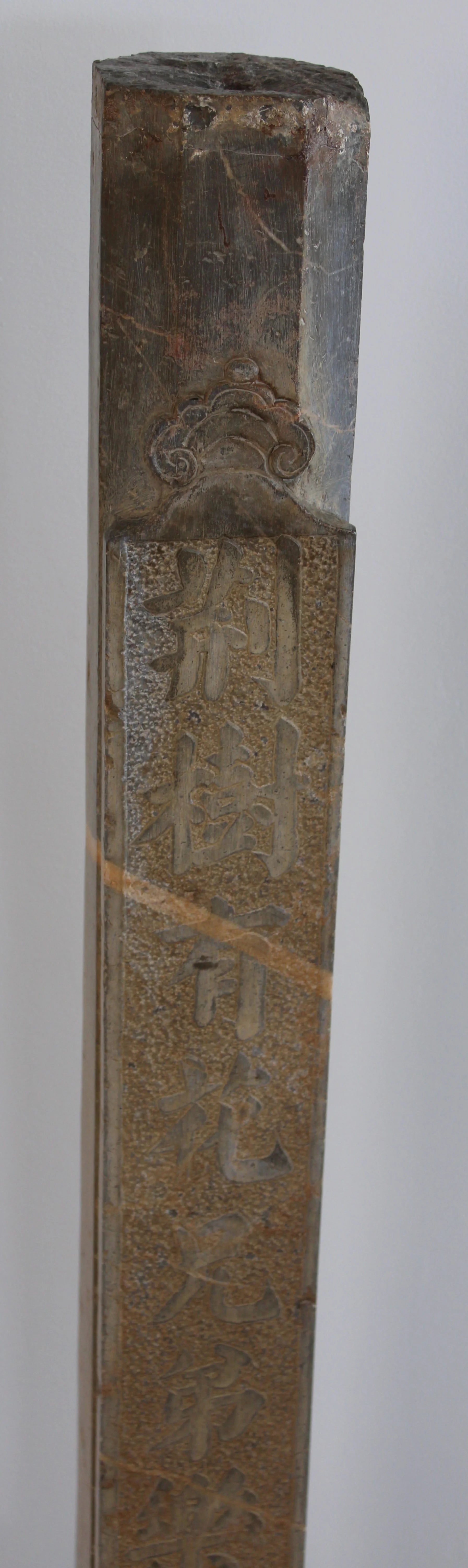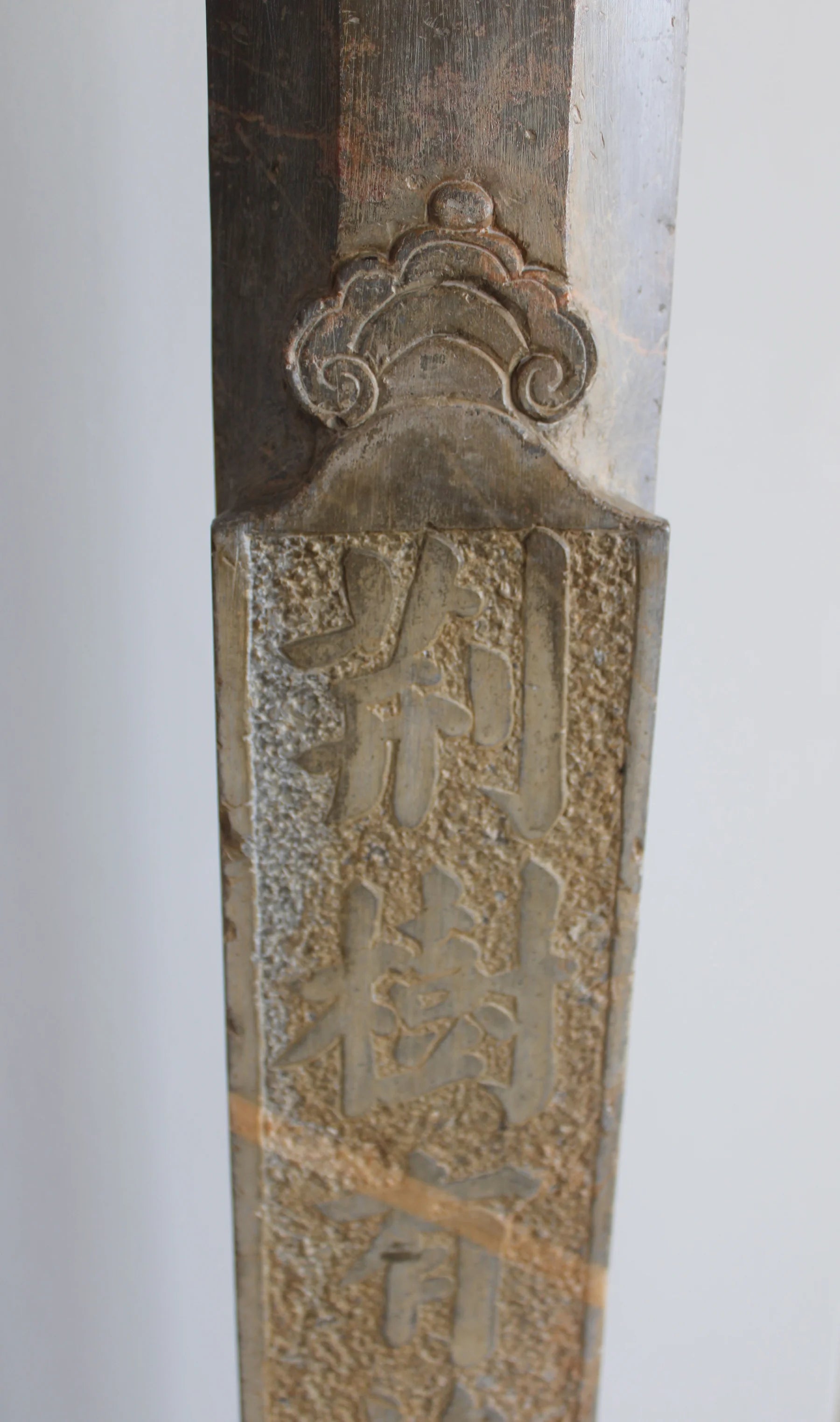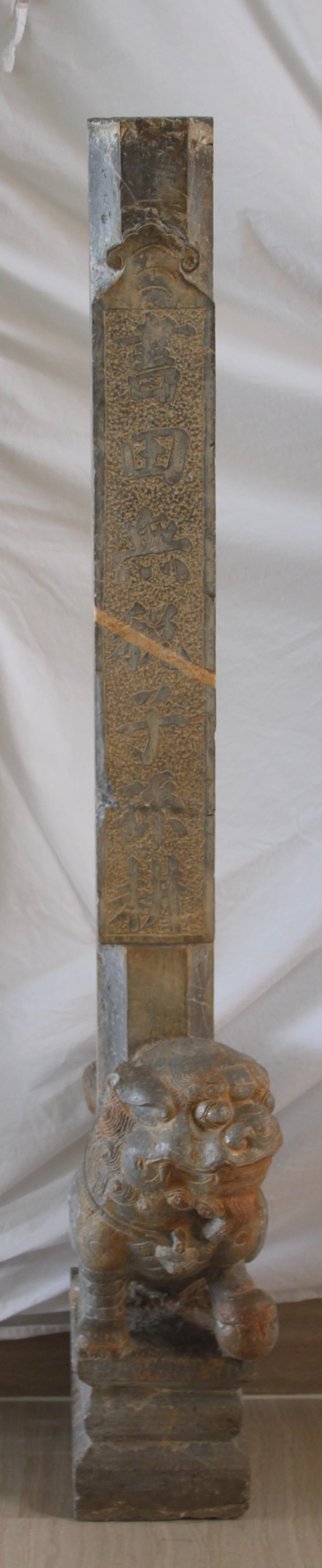 Conjunto de extraordinaria calidad, cada león musculoso y expresivo sostiene una estela con caracteres chinos sobre su espalda. Ricos detalles decorativos y posturas simbólicas realzan su impresionante presencia.
