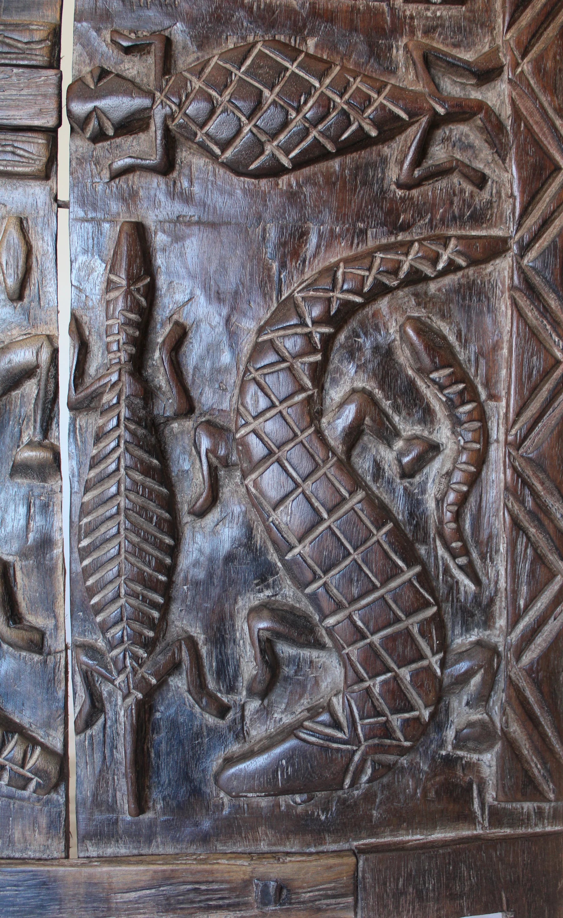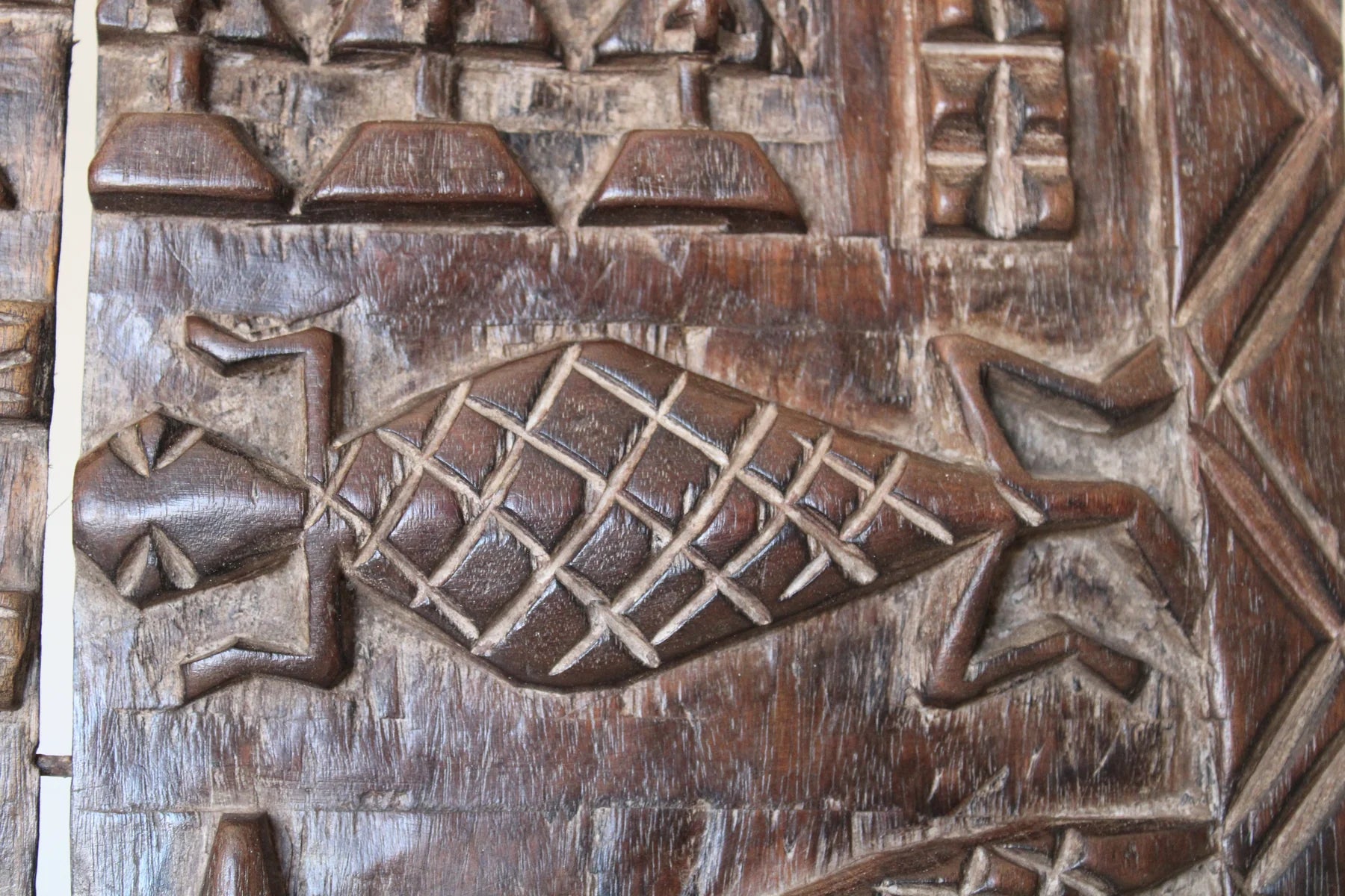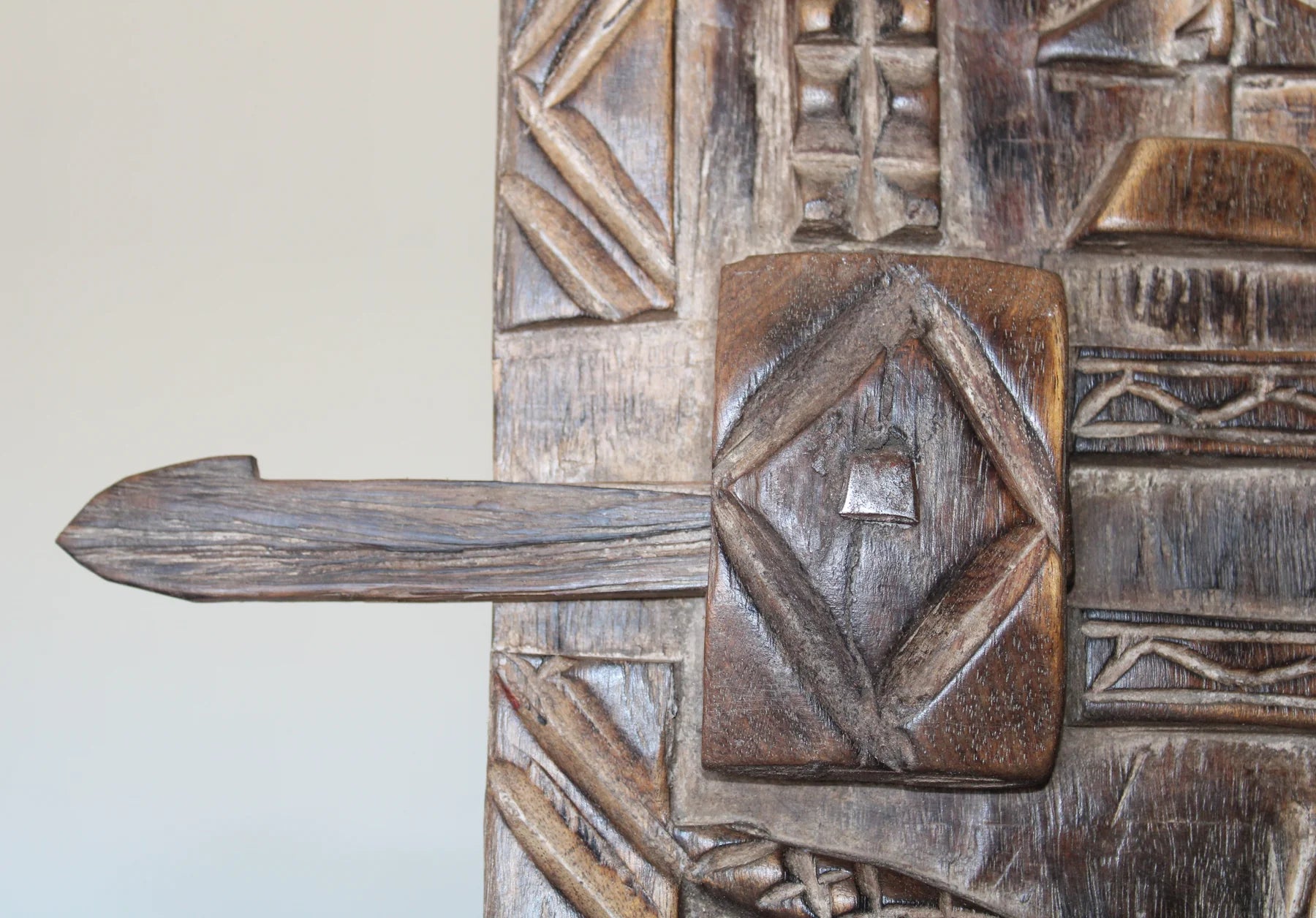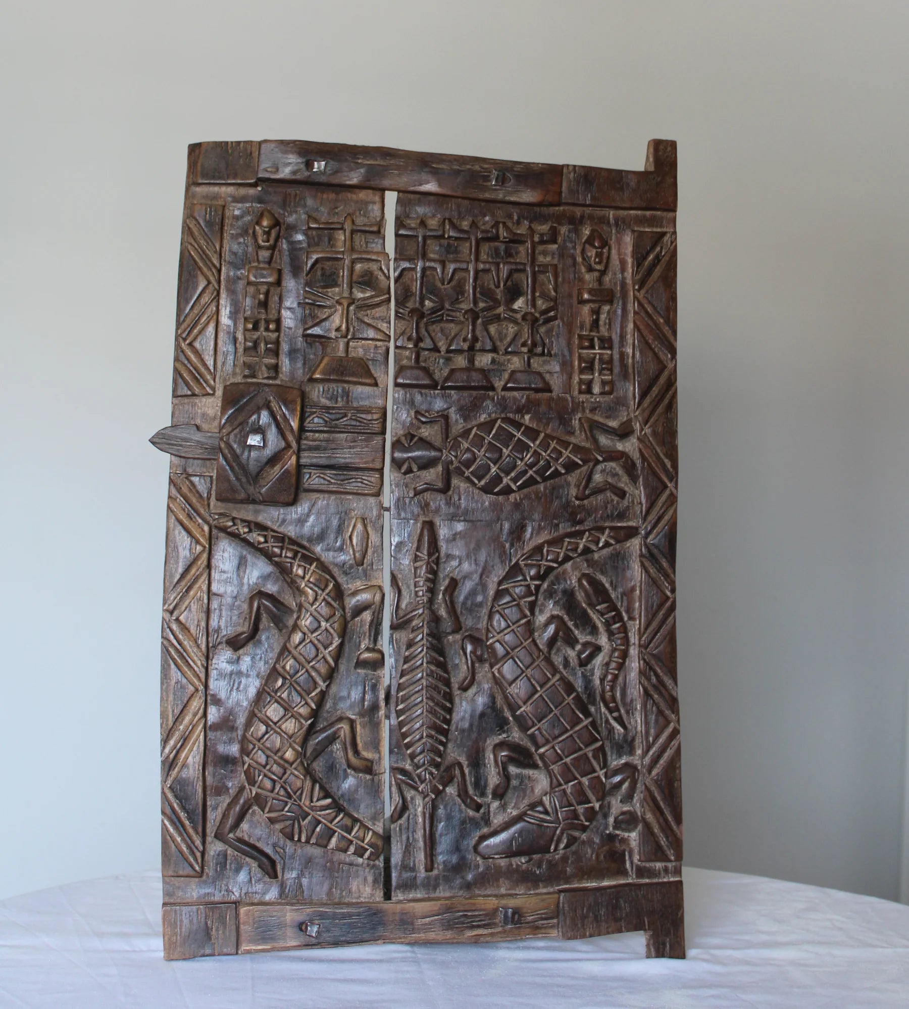 Magnífica puerta de granero Dogón de Mali, elaborada a mano en madera maciza y adornada con relieves de figuras antropomórficas, cocodrilos y patrones geométricos.
