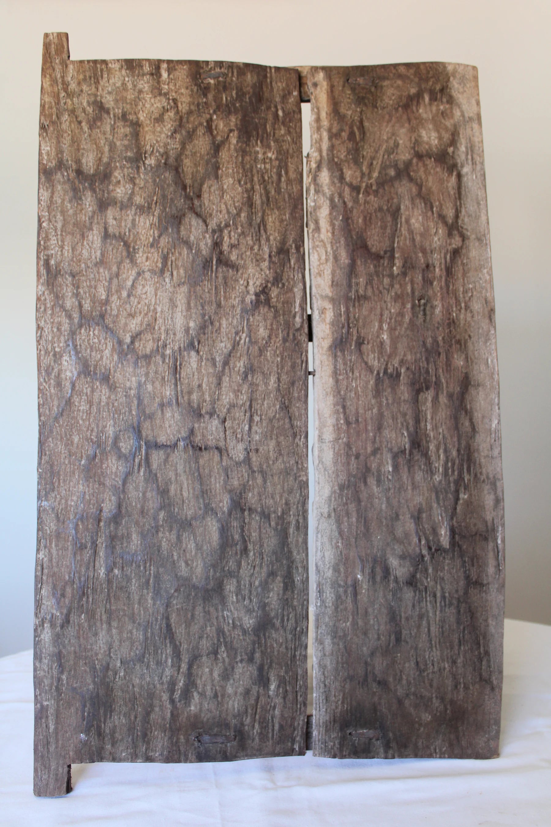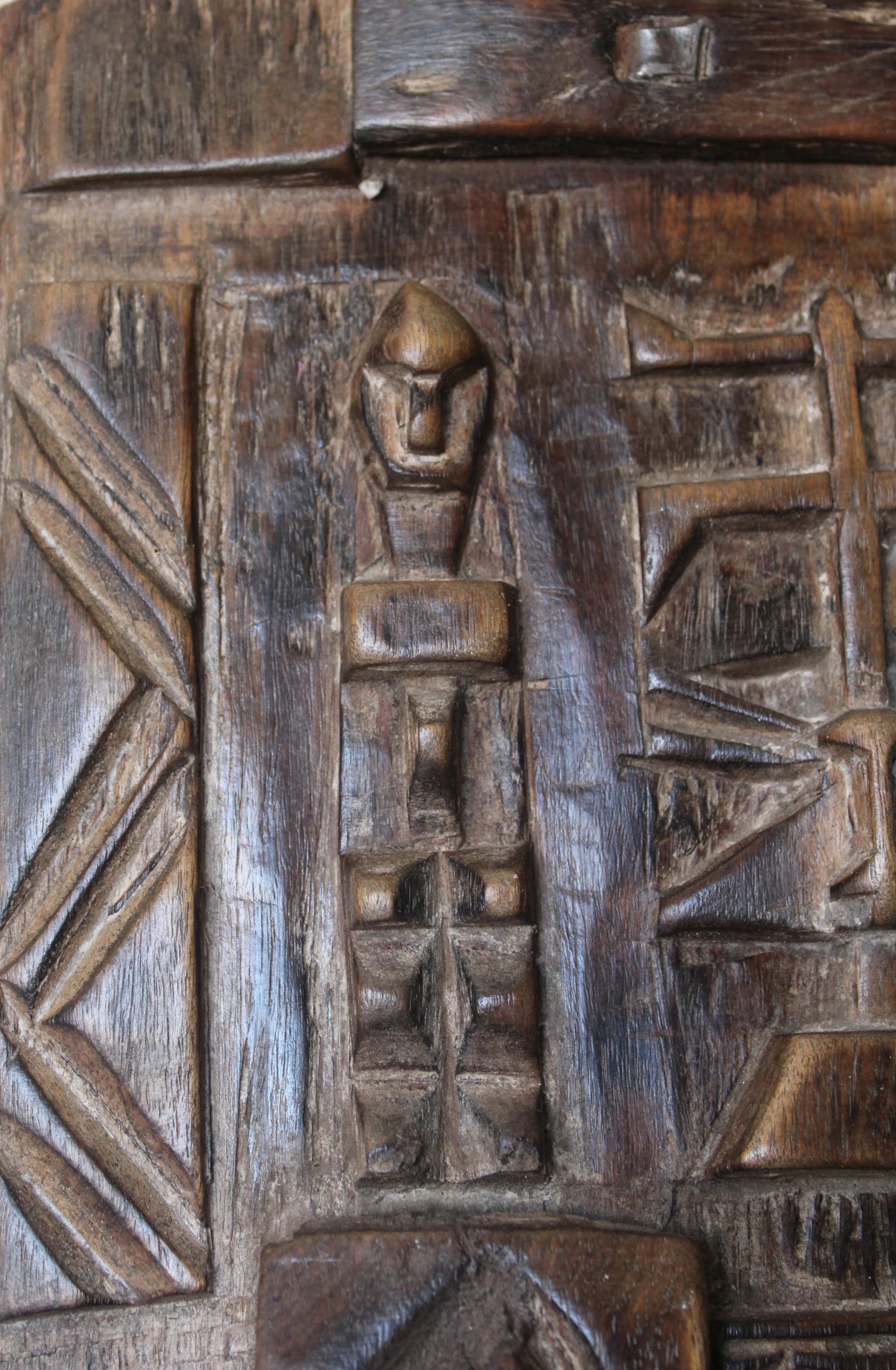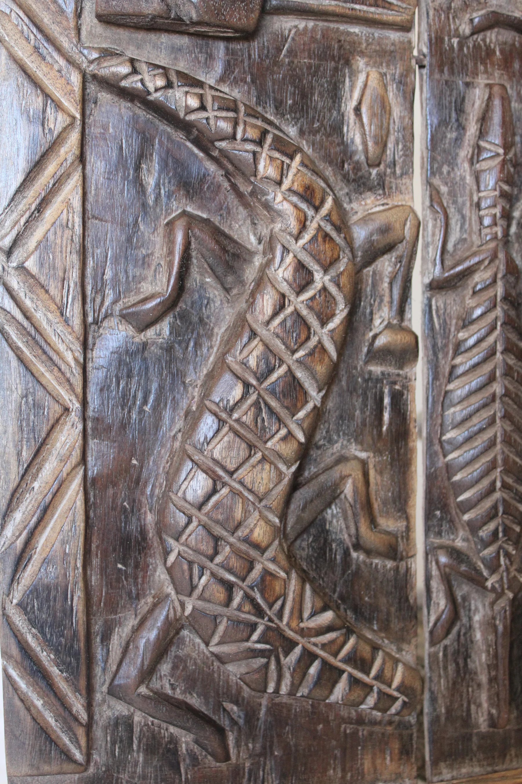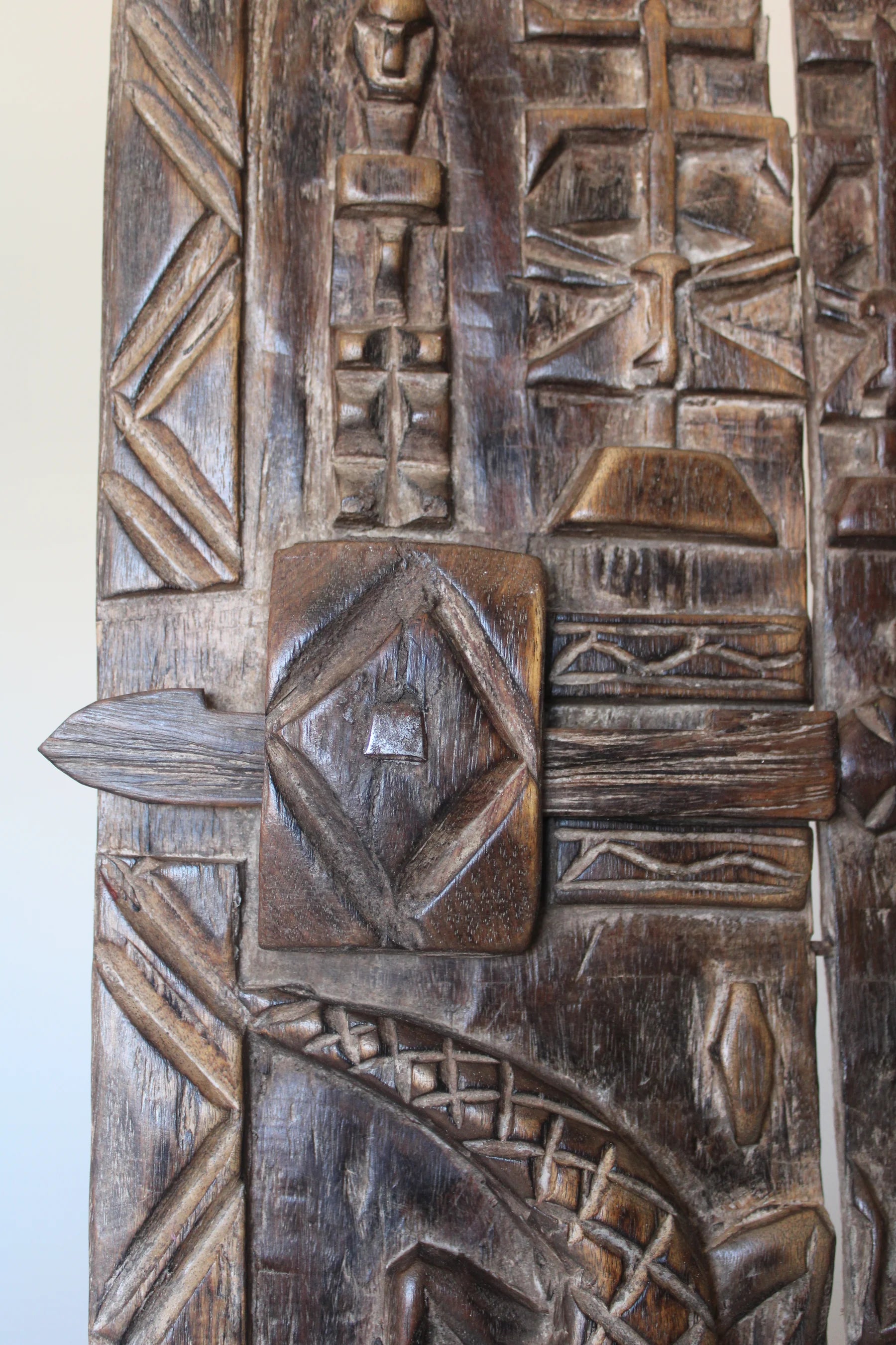 Magnífica puerta de granero Dogón de Mali, elaborada a mano en madera maciza y adornada con relieves de figuras antropomórficas, cocodrilos y patrones geométricos.